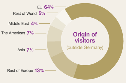 来自德国以外的参展商和观众的比例分别为48%和34%,海外参展商的比例继续有所增加,但海外观众的比例有轻微下跌。继德国之后参展商最多的国家分别是:意大利、土耳其、中国、荷兰、瑞士、西班牙、奥地利、法国和美国。继德国之后观众最多的国家分别是:奥地利、荷兰、瑞典、瑞士、英国、意大利、丹麦、比利时、印度、捷克共和国和波兰。