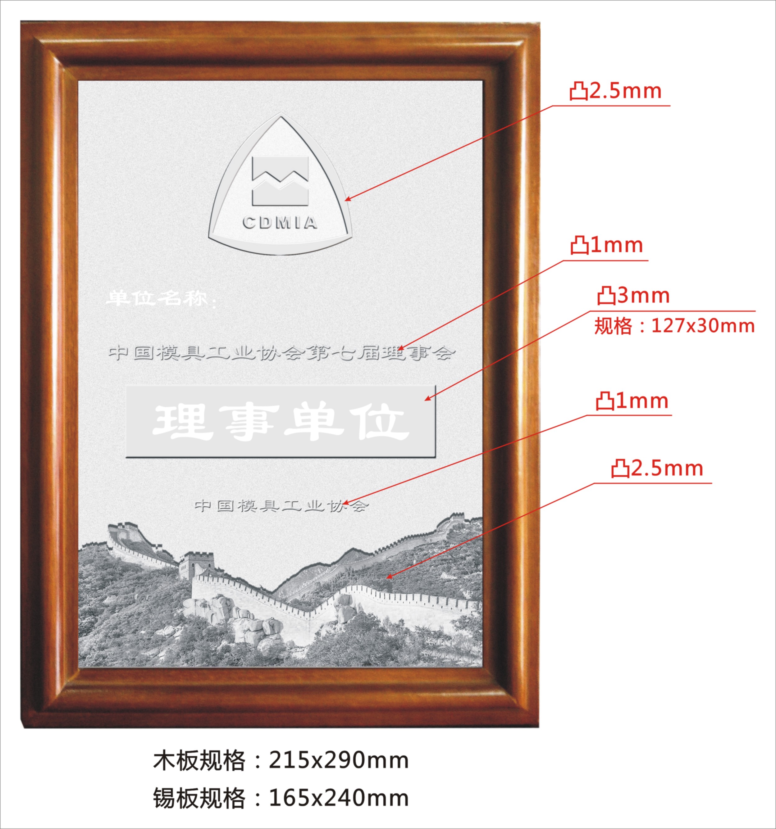 中国模具工业协会第七届理事会换届后,为规范协会的管理,增强理事、常务理事、会长、副会长的责任感、荣誉感。我们为选为理事、常务理事、会长、副会长颁发了任职证书。同时决定为理事单位、常务理事单位、会长单位、副会长单位制作标牌。考虑到换届后理事、常务理事的增补和调整,标牌制作作了适当延迟。现在标牌已完成设计制作方案(见标牌式样效果图,标牌材质采用锡版模具压制,单位名称和职务名称由北京精雕科技集团有限公司雕刻并开始制作),准备在今年10月北京召开的七届第三次理事会上颁发。由于制作工作量大、时间紧,将视各单位交纳会费情况优先制作发放。希望还没有按规定交纳会费的单位尽快办理交纳会费。并及时与中国模协联系。