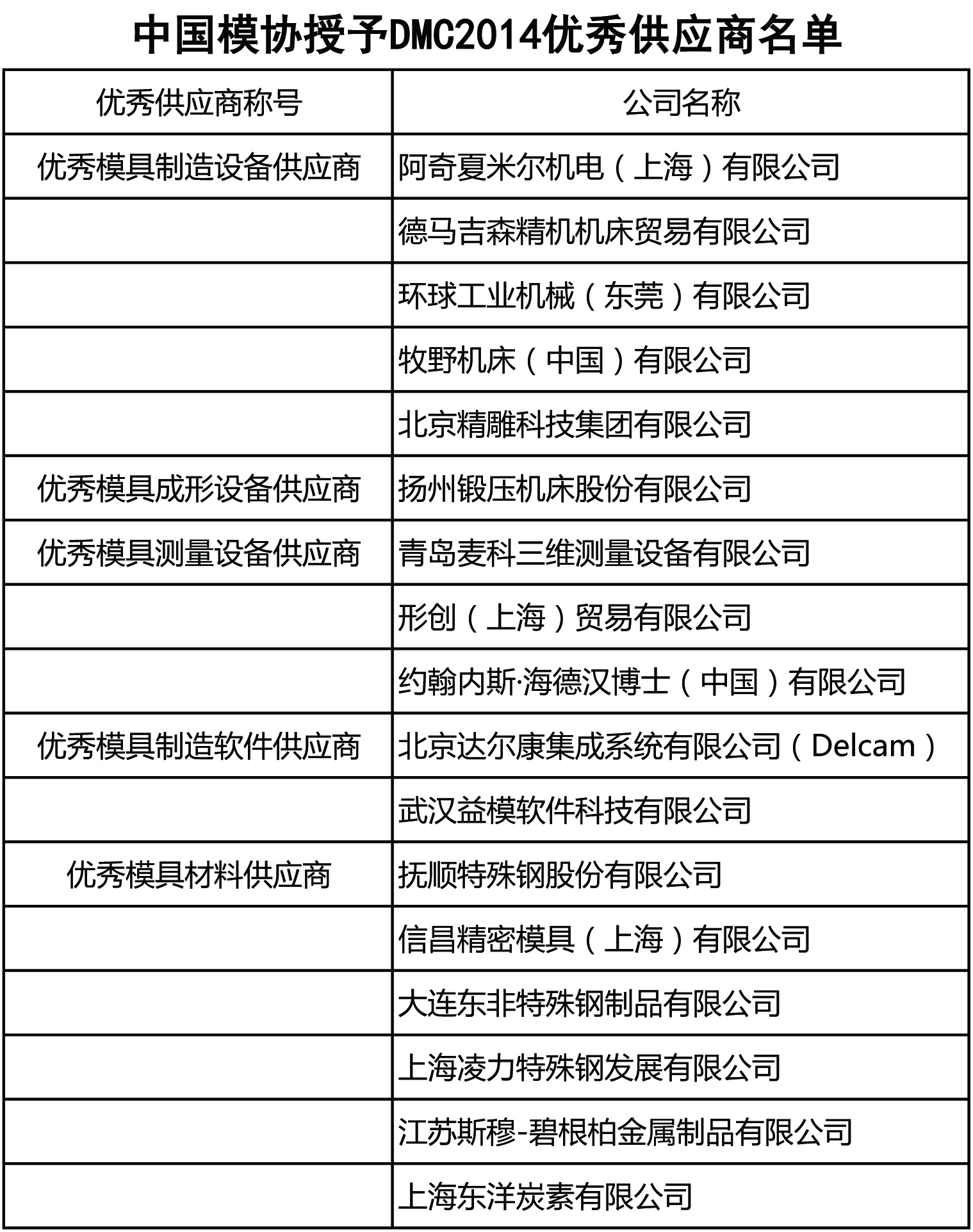 中国模具工业协会授予DMC2014优秀供应商名单