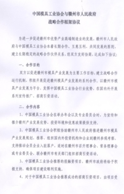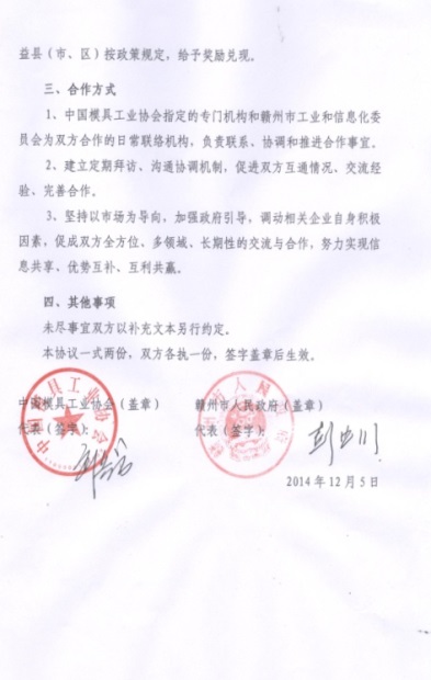 由民政部民间组织管理局举办的“全国性行业协会商会服务地方经济(赣州)工作交流会”于2014年12月5日在江西赣州召开。民政部民间组织管理局领导、江西省民政厅领导、赣州市领导和20家全国性行业协会、商会领导及其会员企业负责人出席了会议,13家全国性行业协会商会分别与赣州市人民政府签署了战略合作协议。中国模具工业协会常务副会长兼秘书长武兵书参加了会议,并代表中国模具工业协会与赣州市人民政府签署了战略合作框架协议。