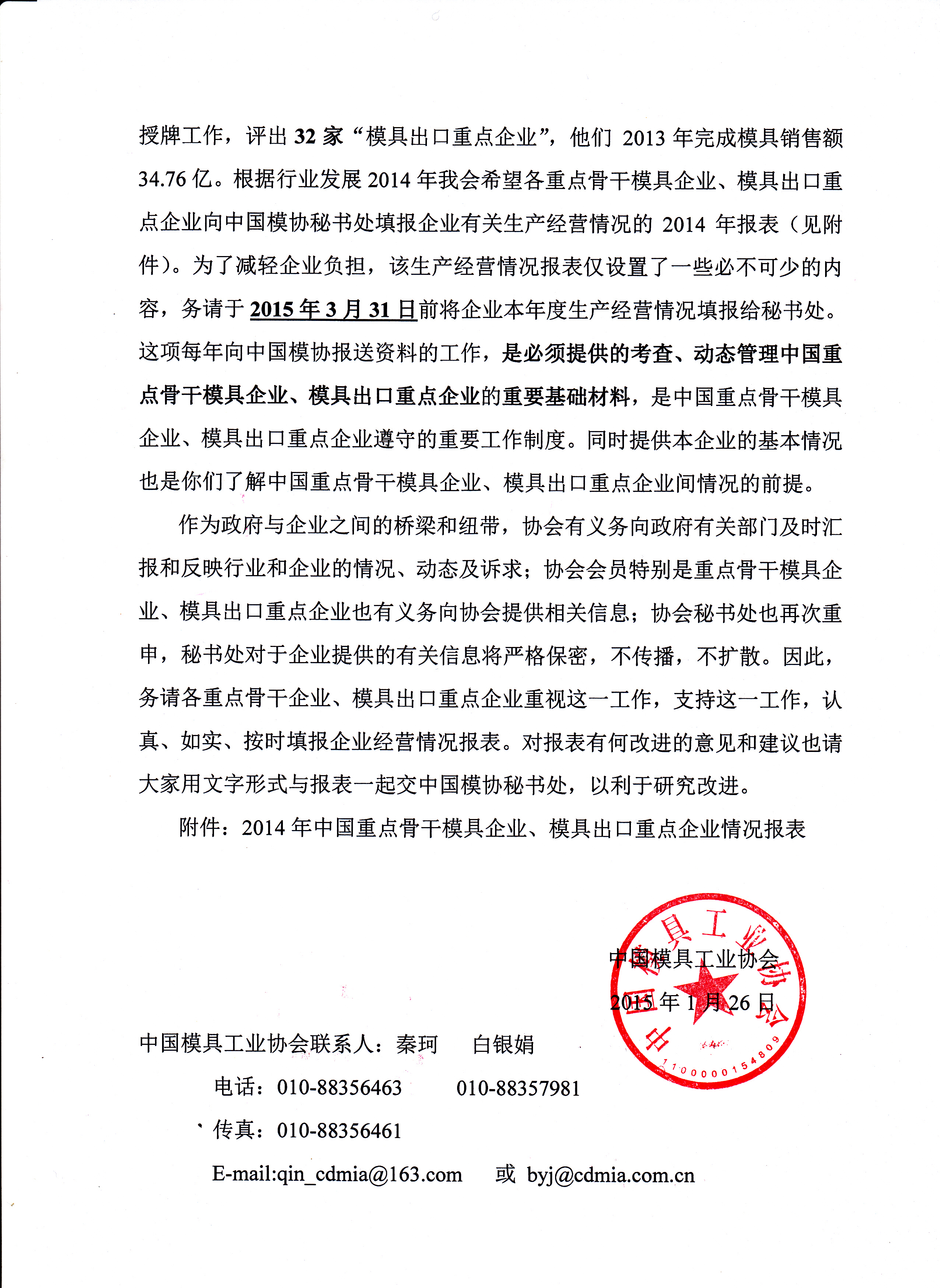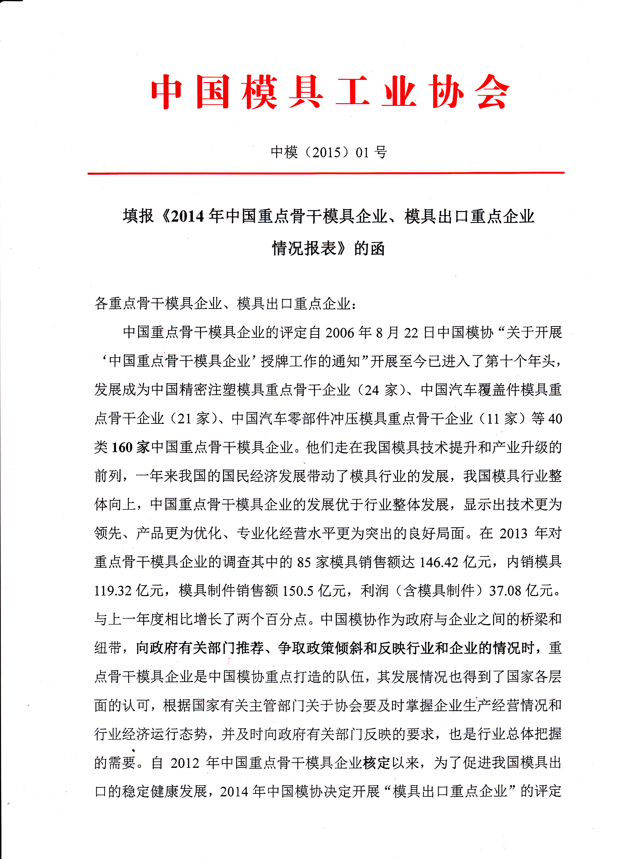 填报《2014年中国重点骨干模具企业、模具出口重点企业情况报表》的函