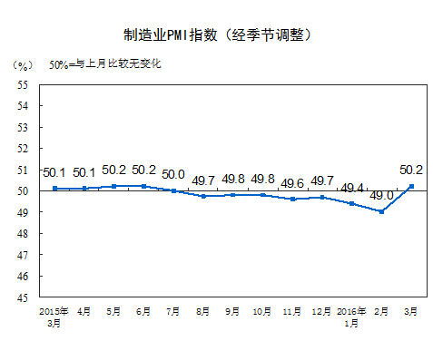 中国经济网北京4月1日讯 今天,国家统计局发布3月份制造业数据,数据显示,3月中国制造业采购经理指数(PMI)为50.2%,比上月上升1.2个百分点,重回扩张区间。