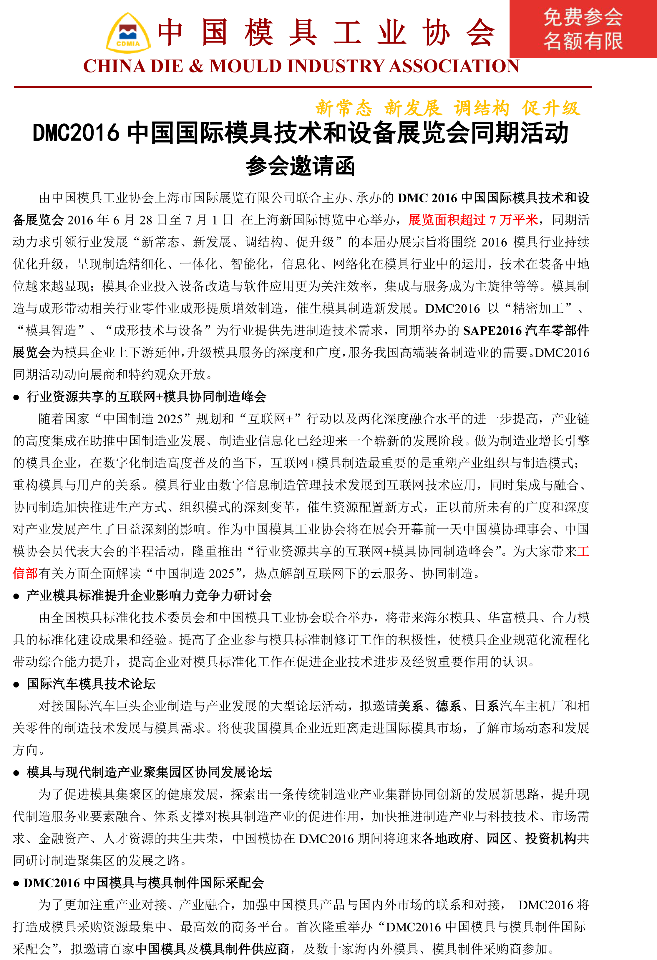 DMC2016中国国际模具技术和设备展览会同期活动 参会邀请函
