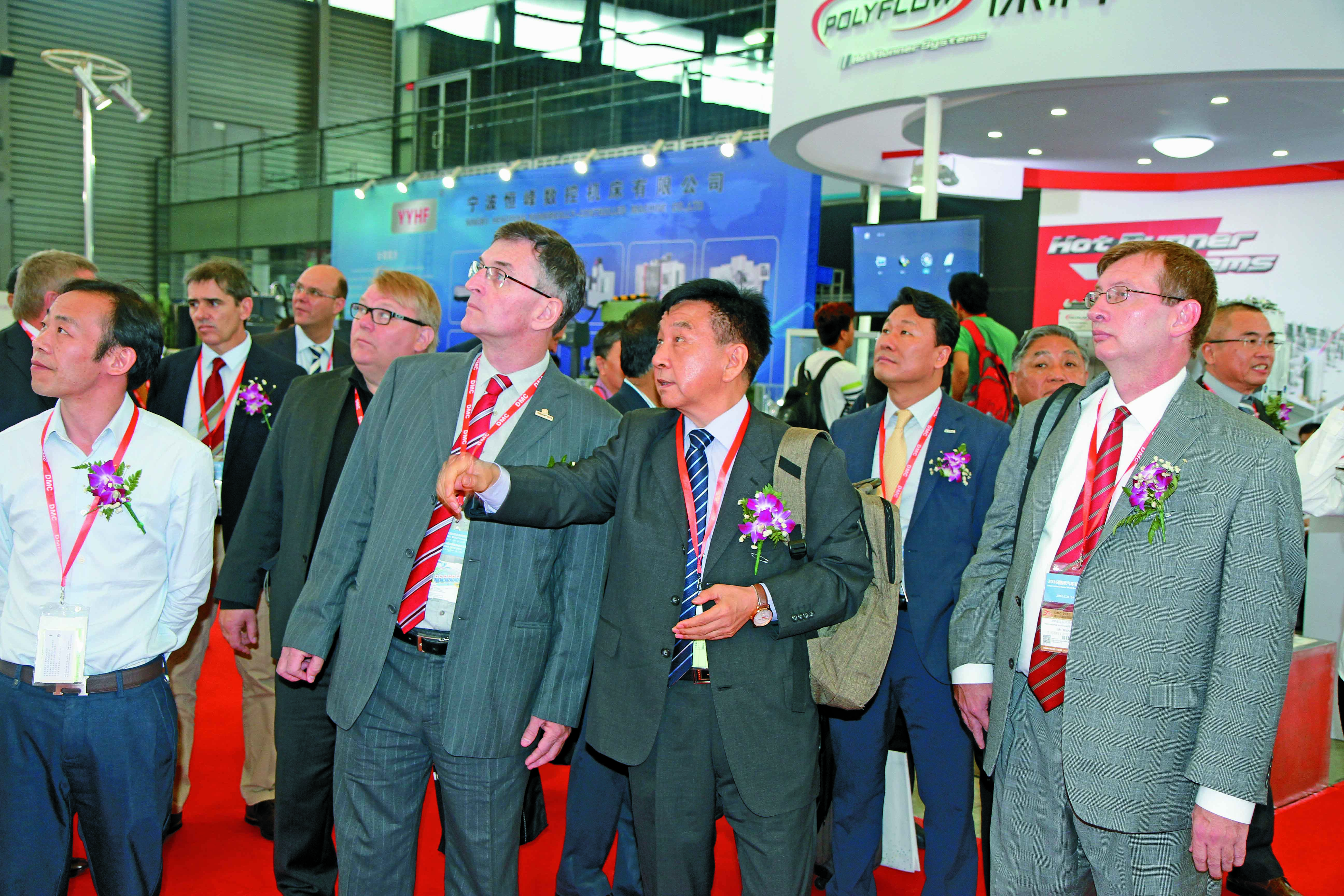 图为开幕首日中国模具工业协会常务副会长兼秘书长武兵书先生与来自全球各国的模协负责人及重要嘉宾组成的贵宾团正在参观展会。