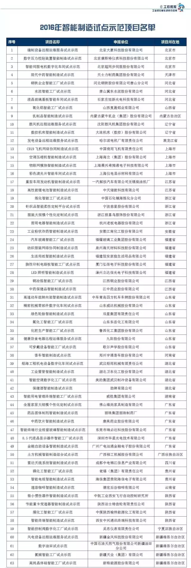 按照《智能制造试点示范2016专项行动实施方案》和《关于开展2016年智能制造试点示范项目推荐的通知》,经各地方工业和信息化主管部门推荐、专家评审,2016年智能制造试点示范项目名单已经确定,现予以公布。