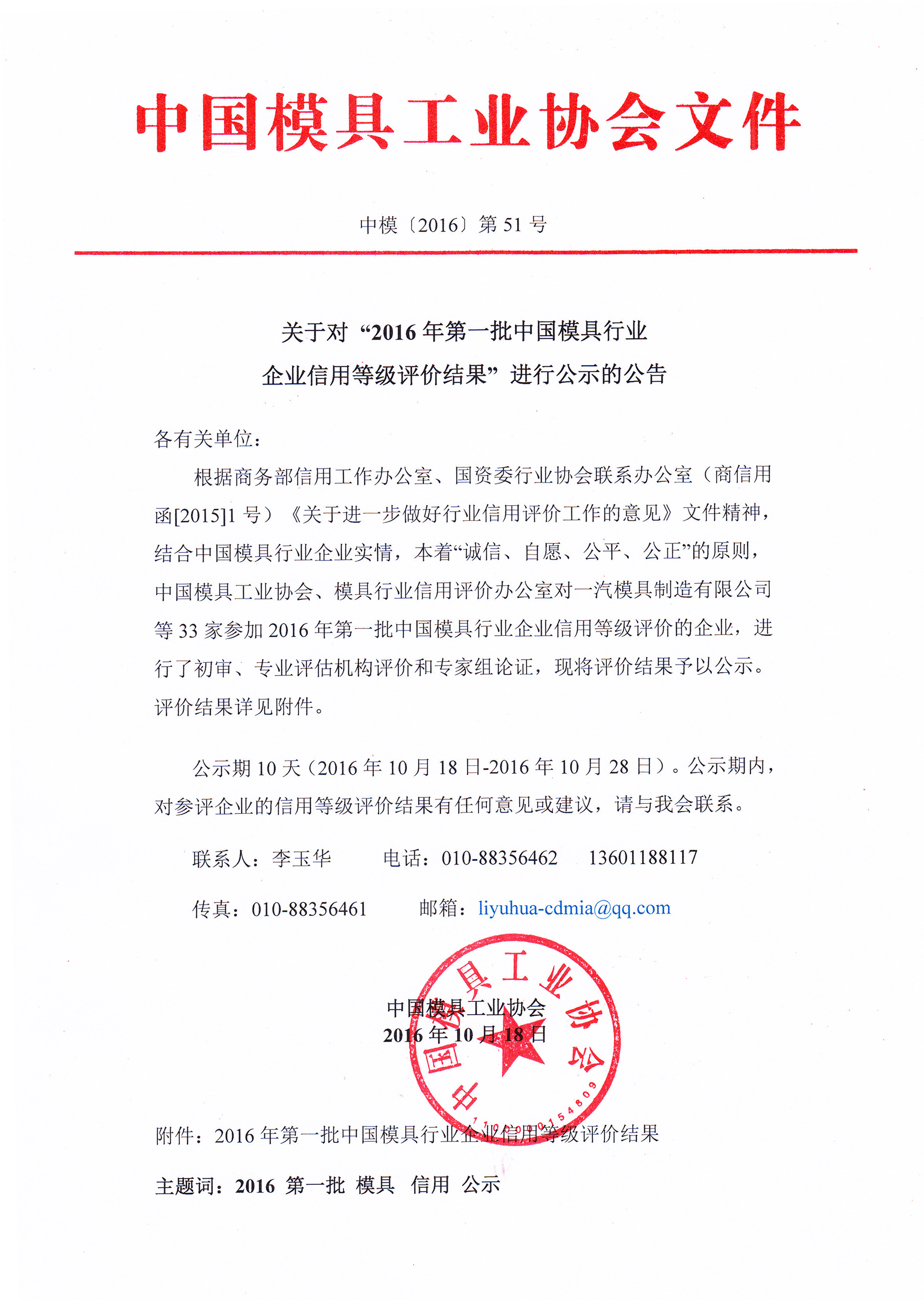 关于对“2016年第一批中国模具行业企业信用等级评价结果”进行公示的公告