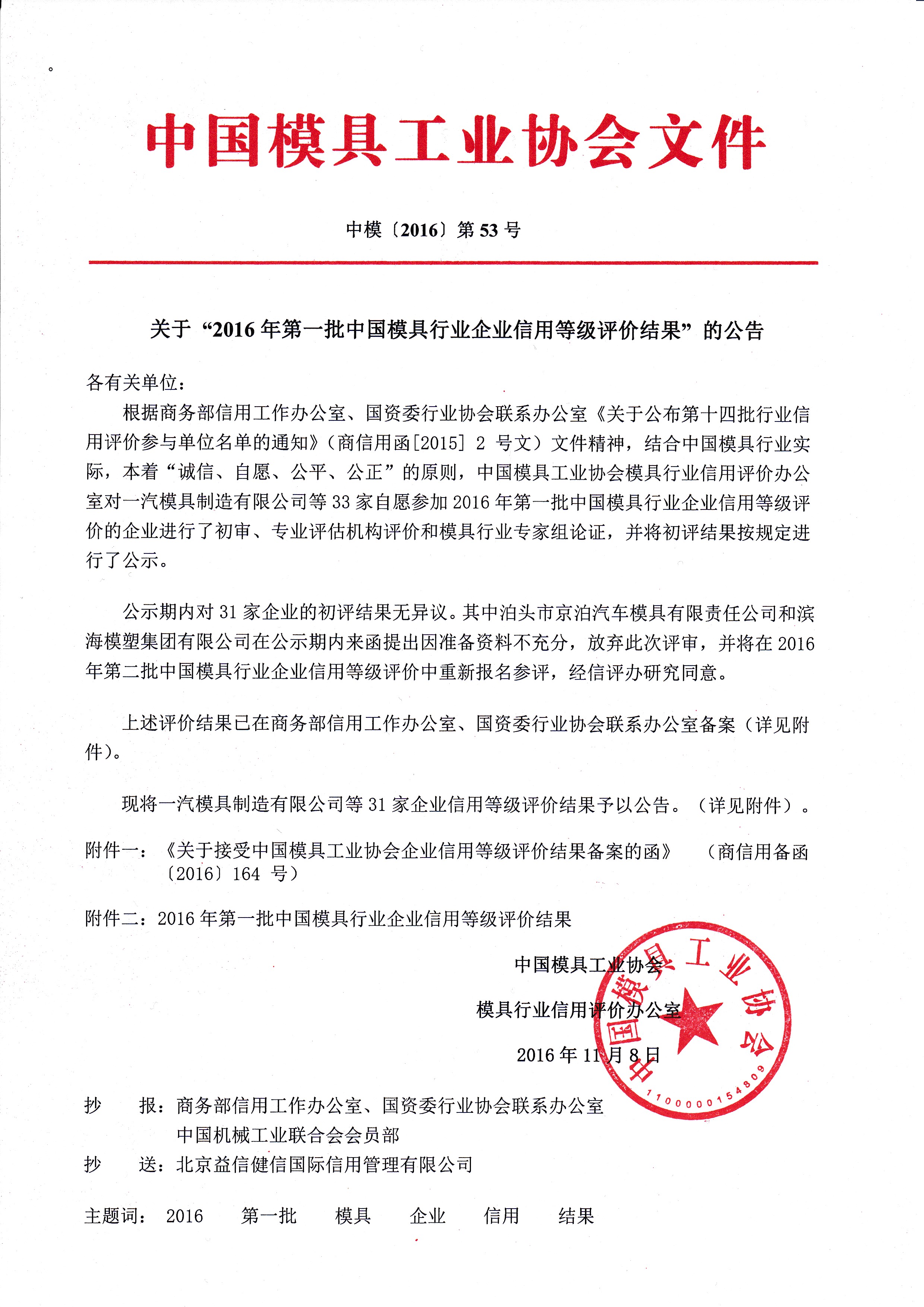 关于“2016年第一批中国模具行业企业信用等级评价结果”的公告