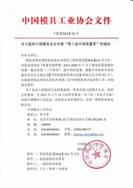 关于组织中国模具企业申报“第三届中国质量奖”的通知