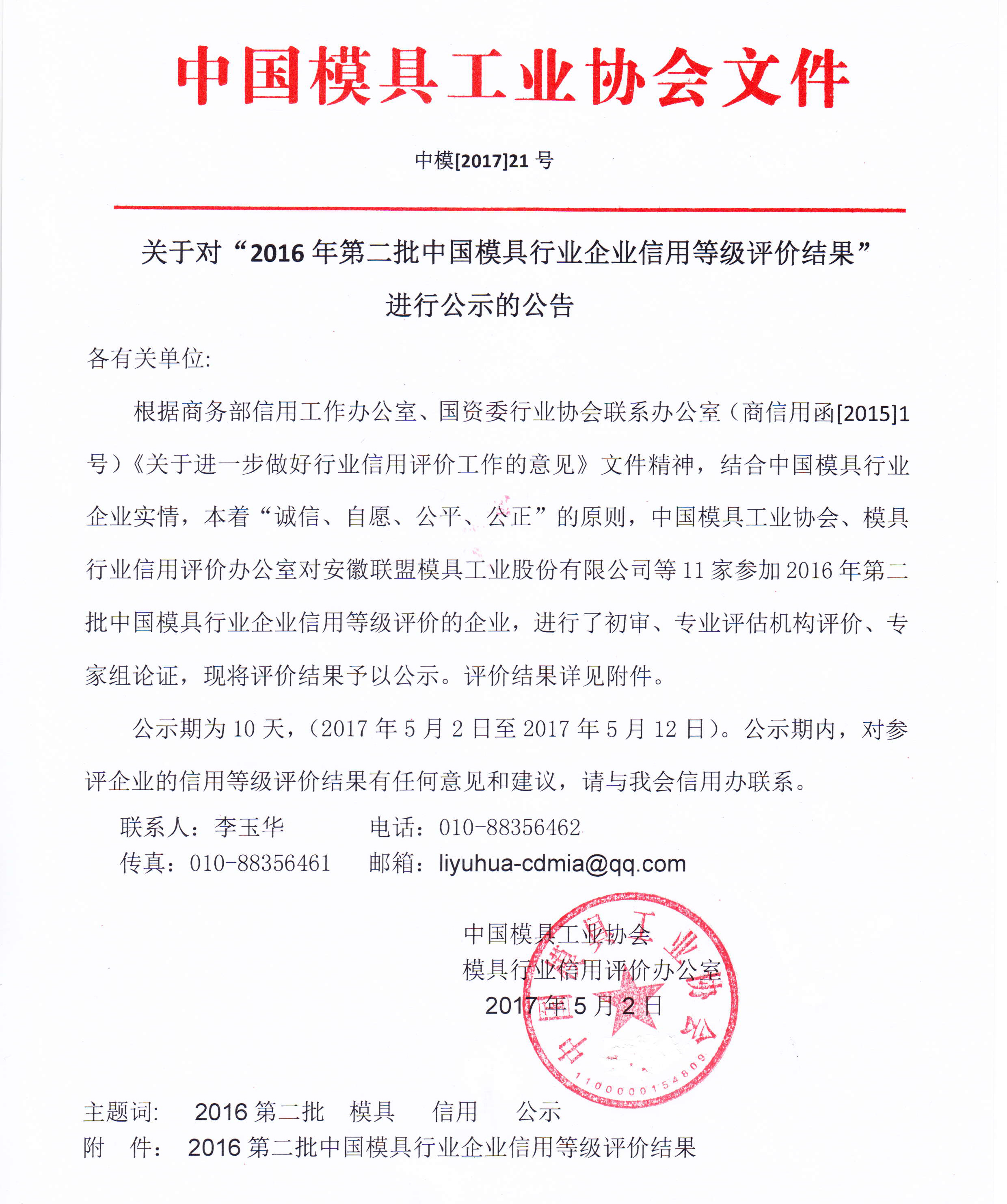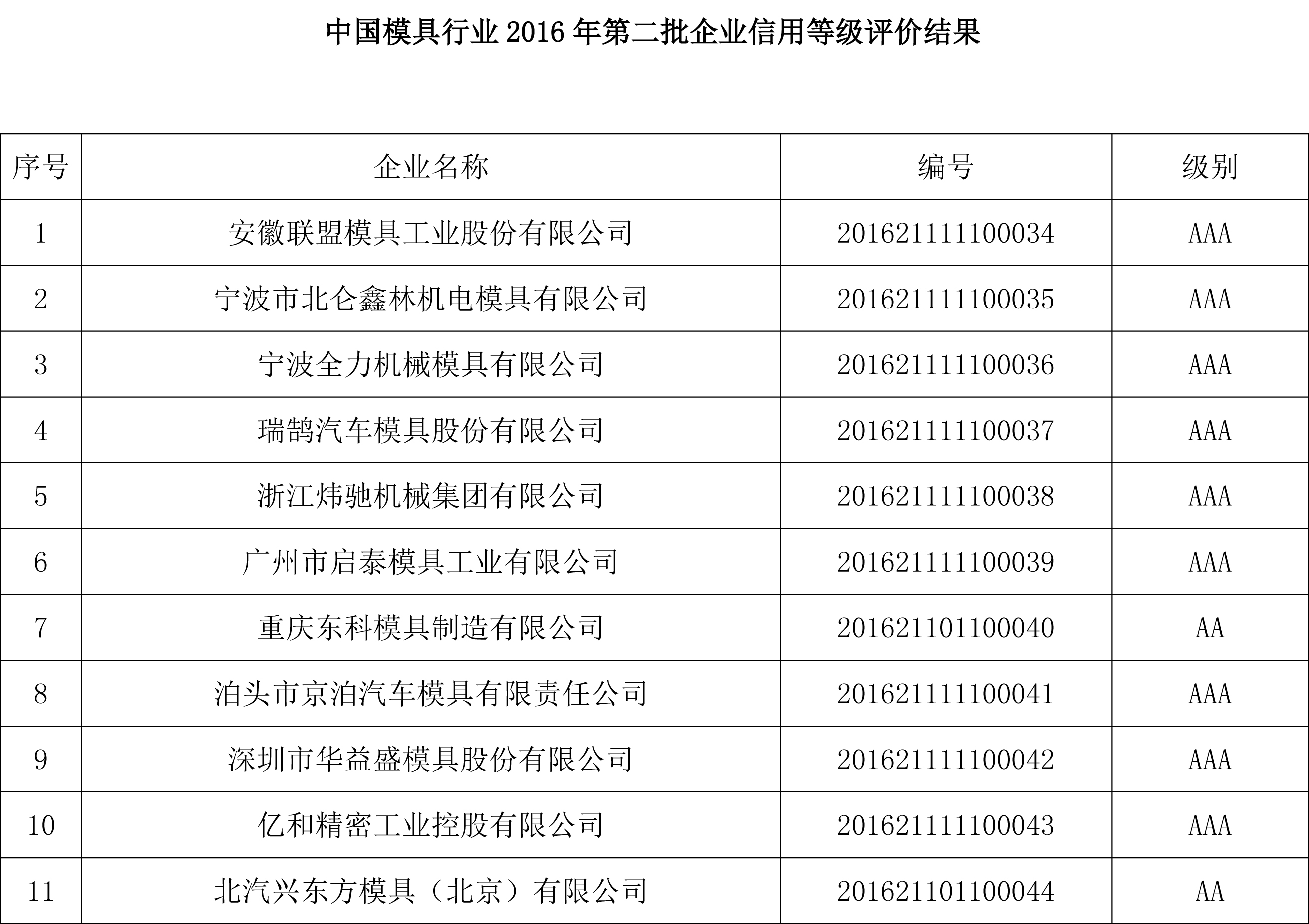 关于对“2016年第二批中国模具行业企业信用等级评价结果”进行公示的公告
