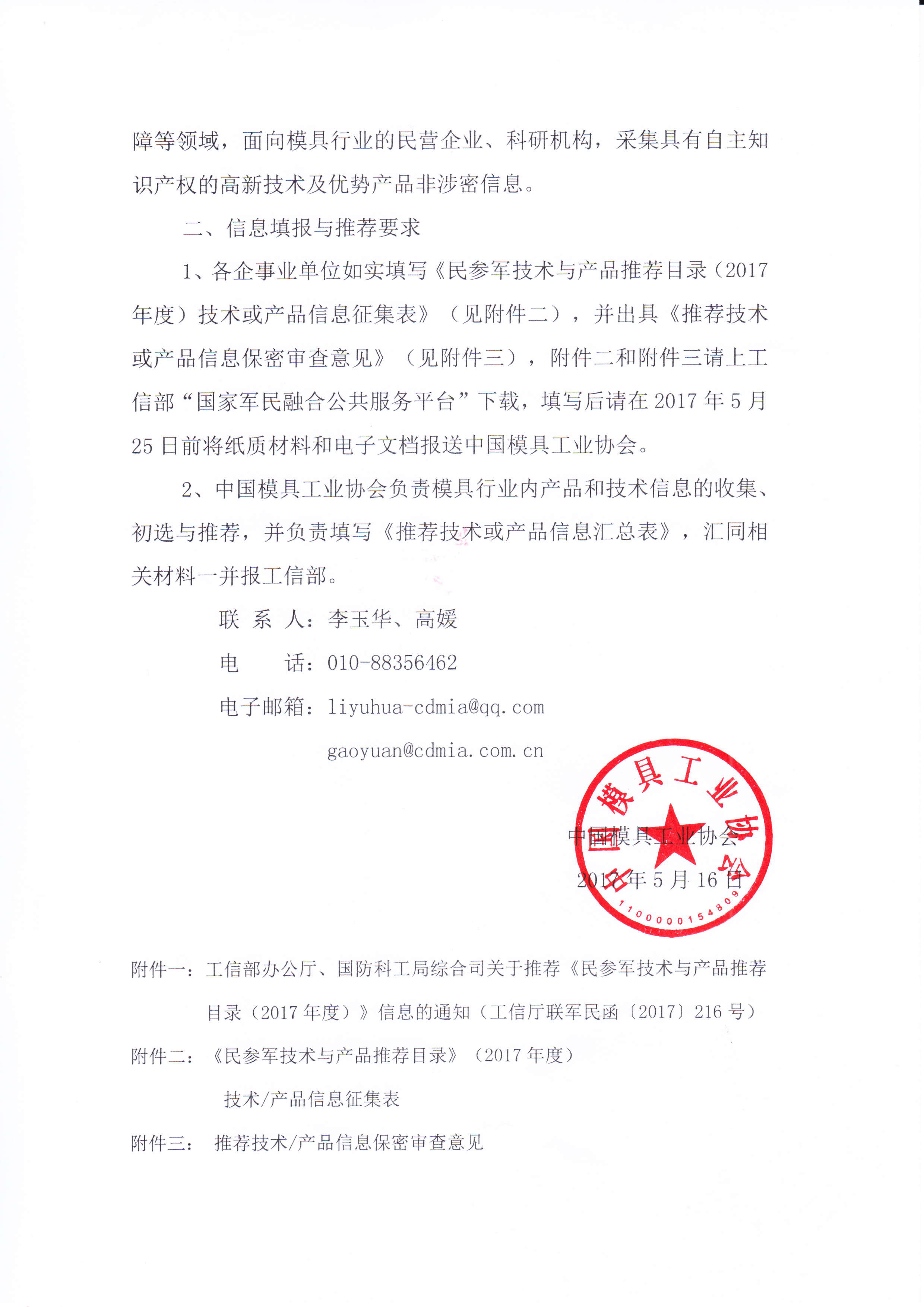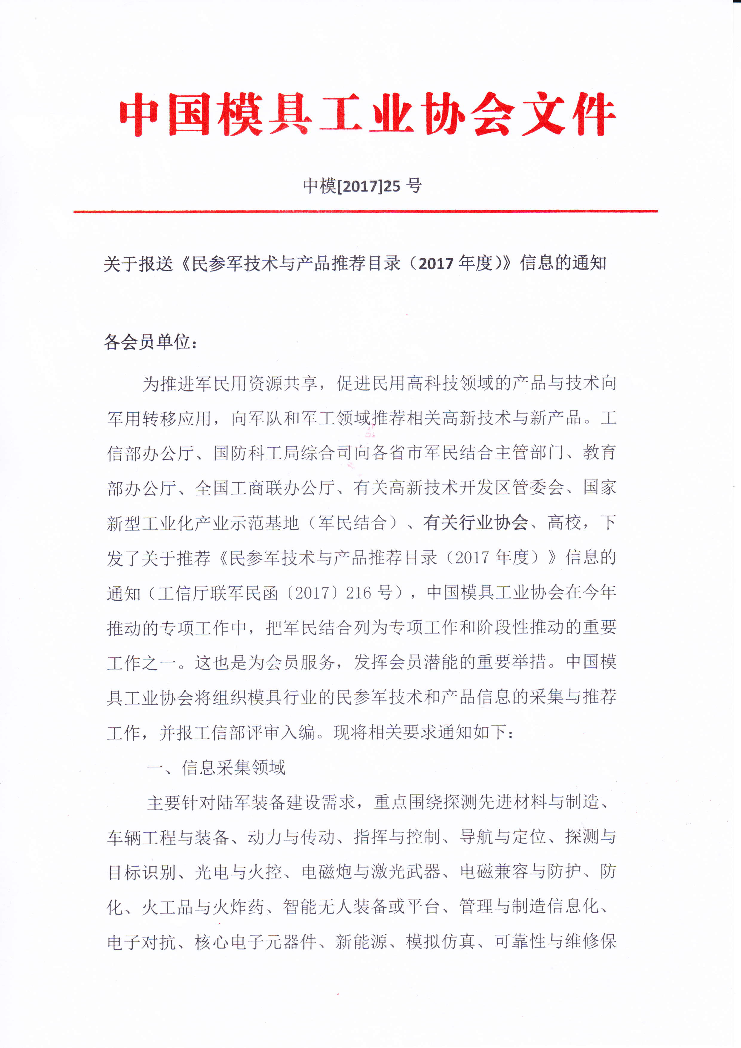 关于报送《民参军技术与产品推荐目录(2017年度)》信息的通知