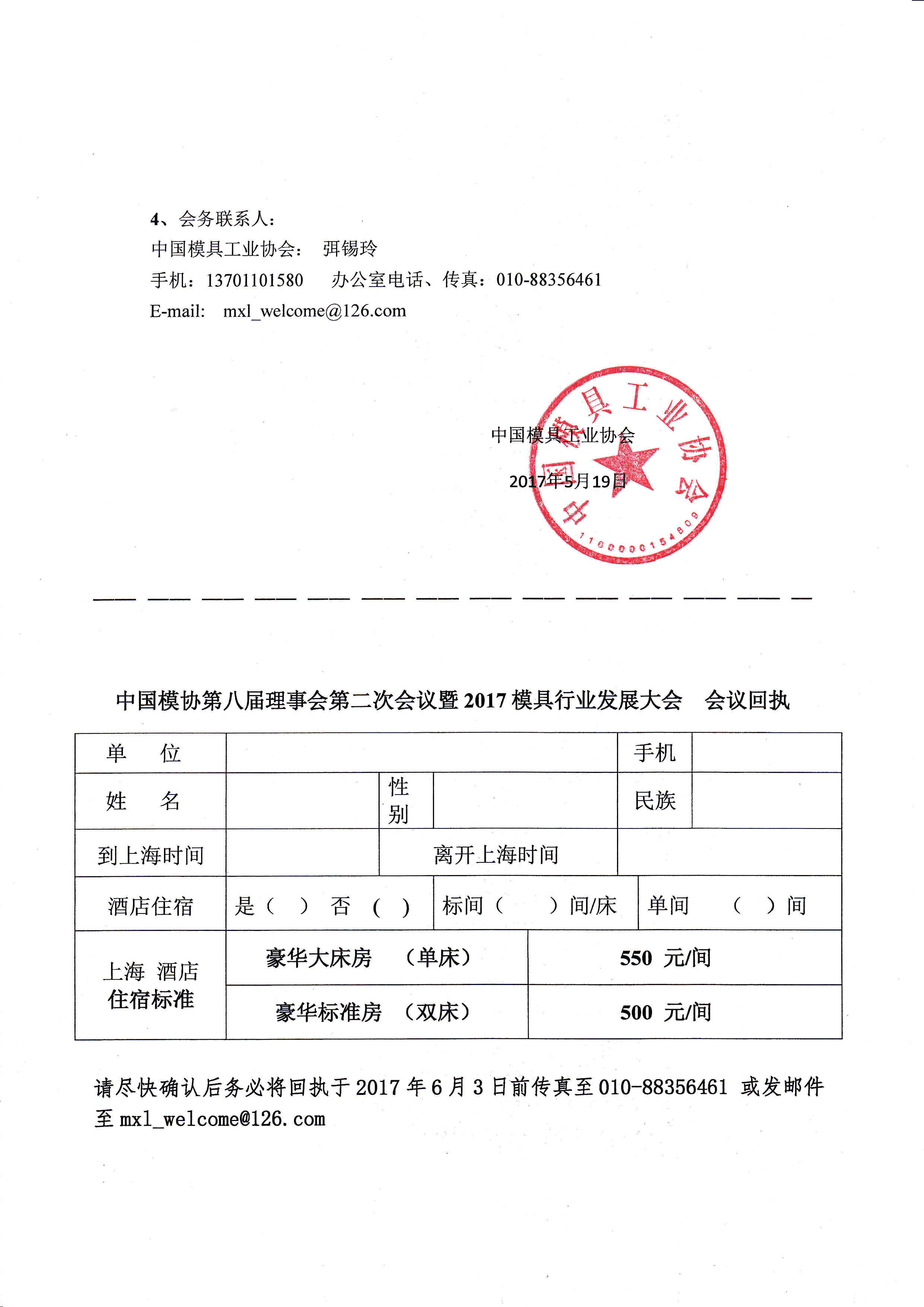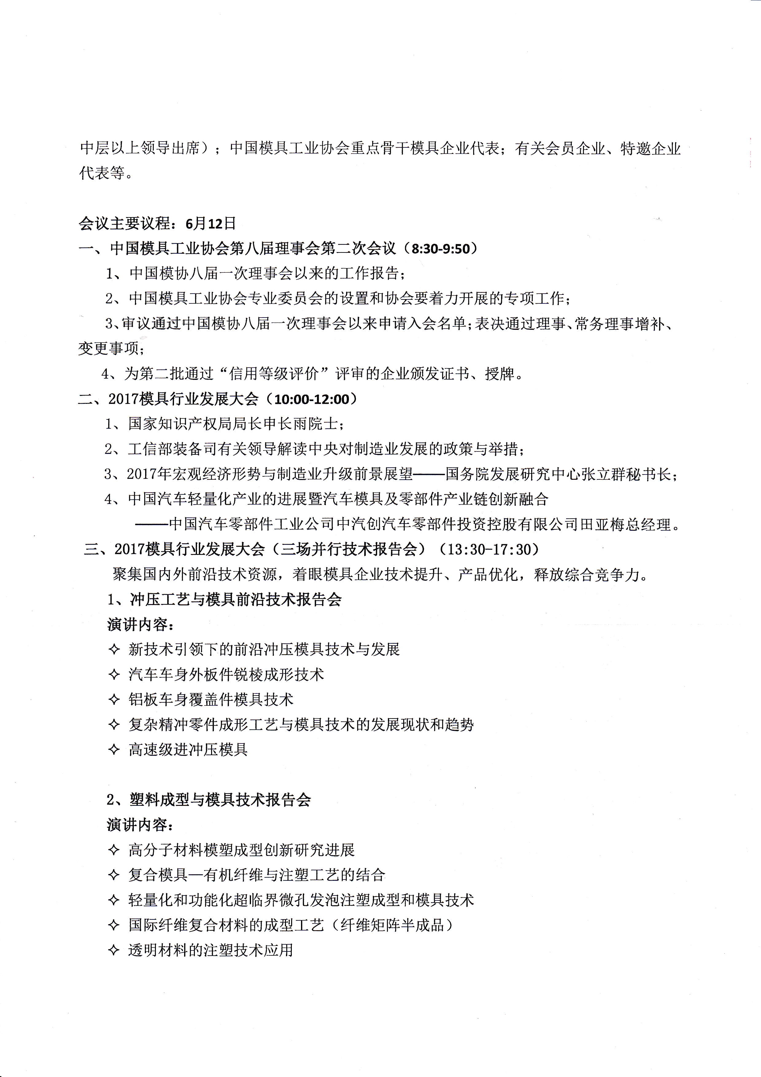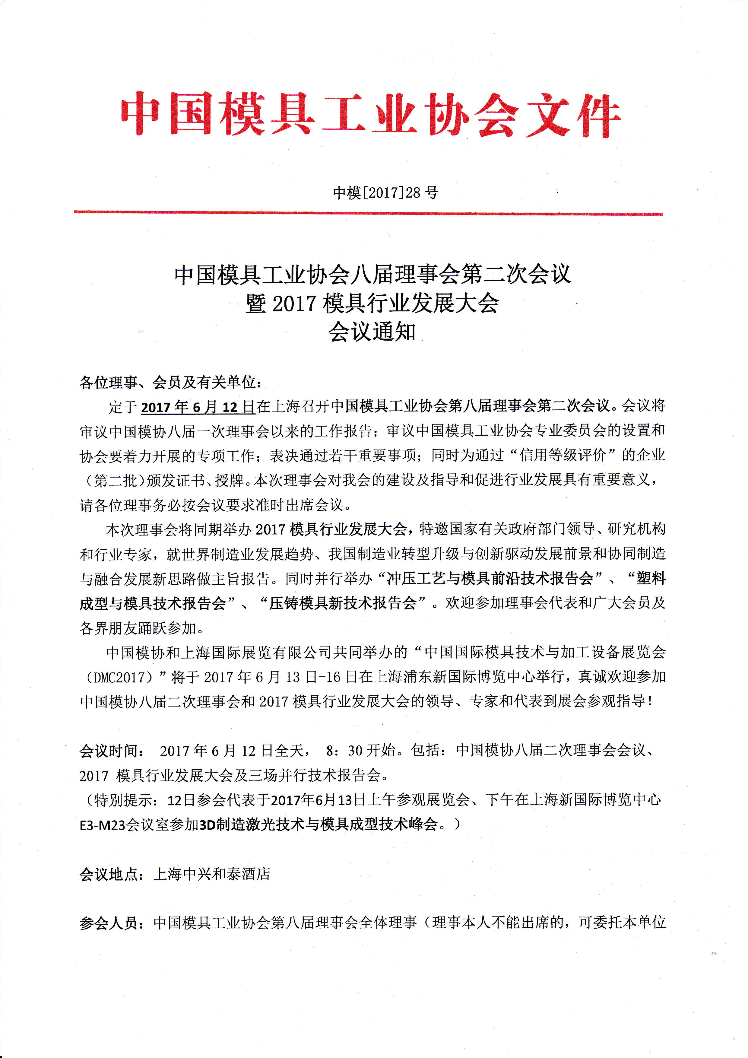 中国模具工业协会八届理事会第二次会议暨2017模具行业发展大会会议通知