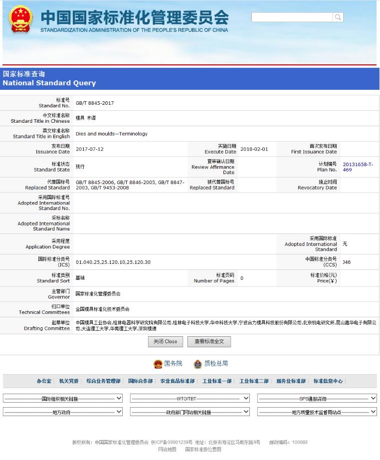 《模具 术语》GB/T 8845-2017将于2018年2月1日正式实施