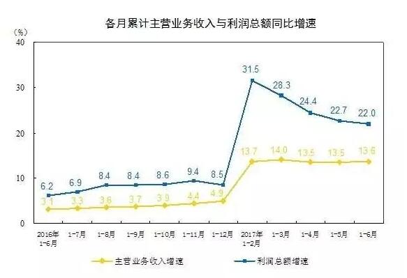 据国家统计局工业司何平博士解读表示,2017年6月份,中国规模以上工业企业利润同比增长19.1%,增速比5月份加快2.4个百分点;上半年,利润同比增长22%,增速比1-5月份放缓0.7个百分点。