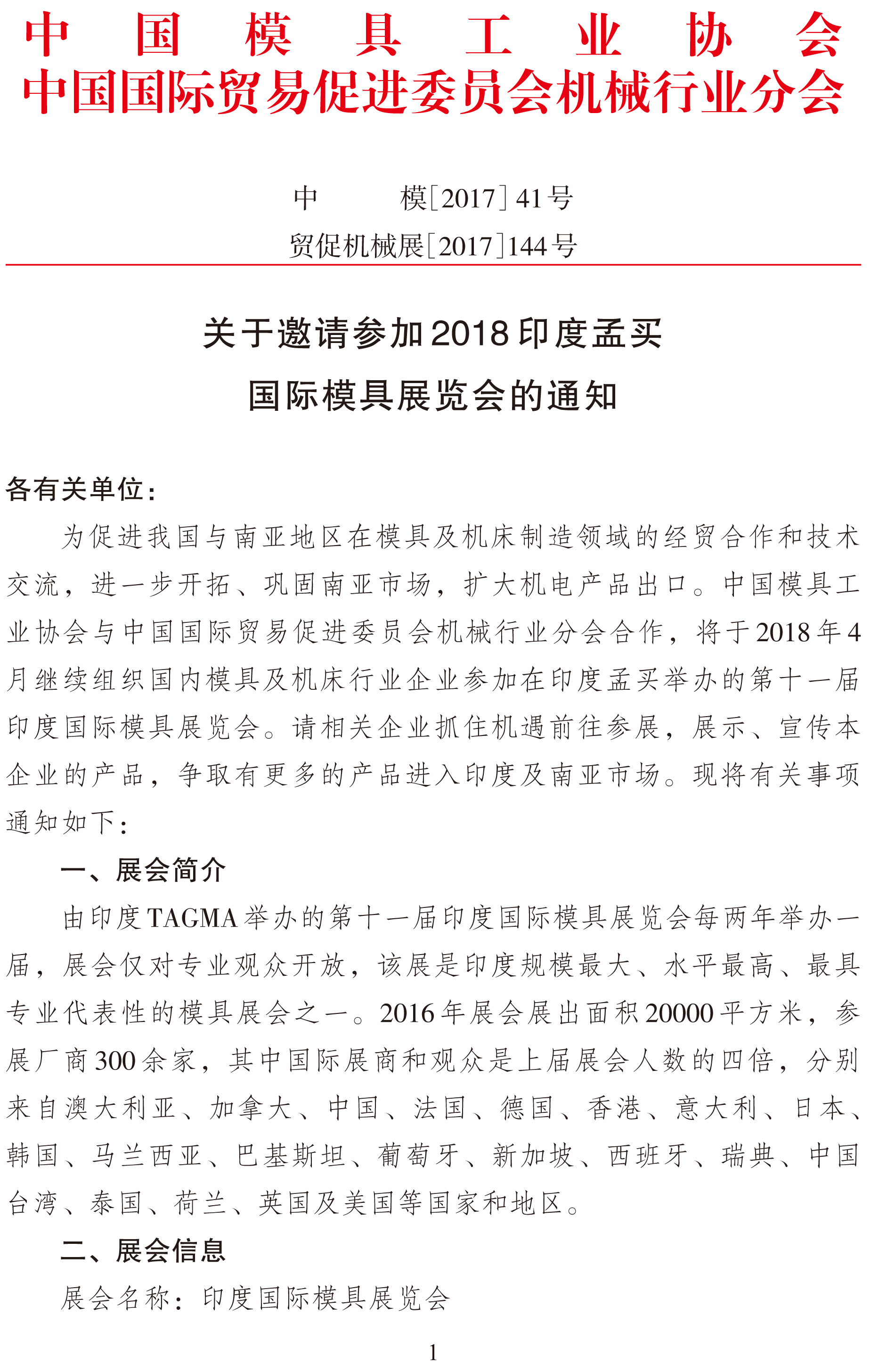 关于邀请参加2018印度孟买国际模具展览会的通知