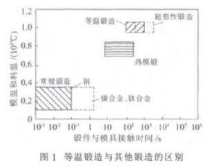 等温锻造指毛坯从始锻到终锻始终在同一温度条件下进行低变形速率的锻造。等温锻造( Iso thermal forging) 成形时,毛坯与模具的加热温度相同, 并且应变速率很低(10-4-10-2s-1), 这样由于消除了模具激冷和材料应变硬化的影响,不仅变形抗力小,而且可以完成净成形(near-net-shape) 加工,因而大大提高了金属的利用率以及锻件的性能。这种新型工艺已经成为先进难变形材料( 如钛合金、镍基高温合金、金属间化合物) 的主要成形方法,其与其他锻造的区别如图1所示。