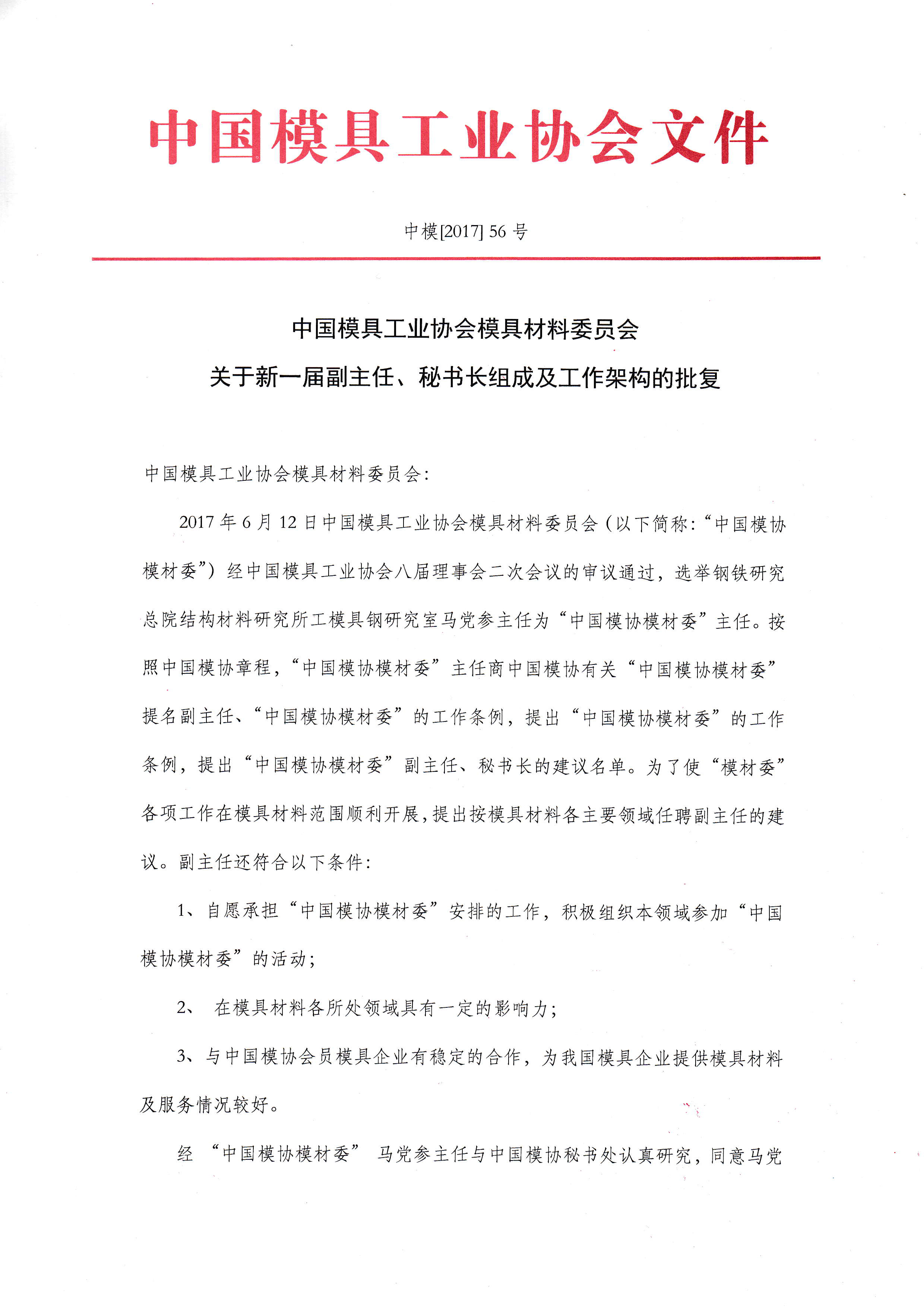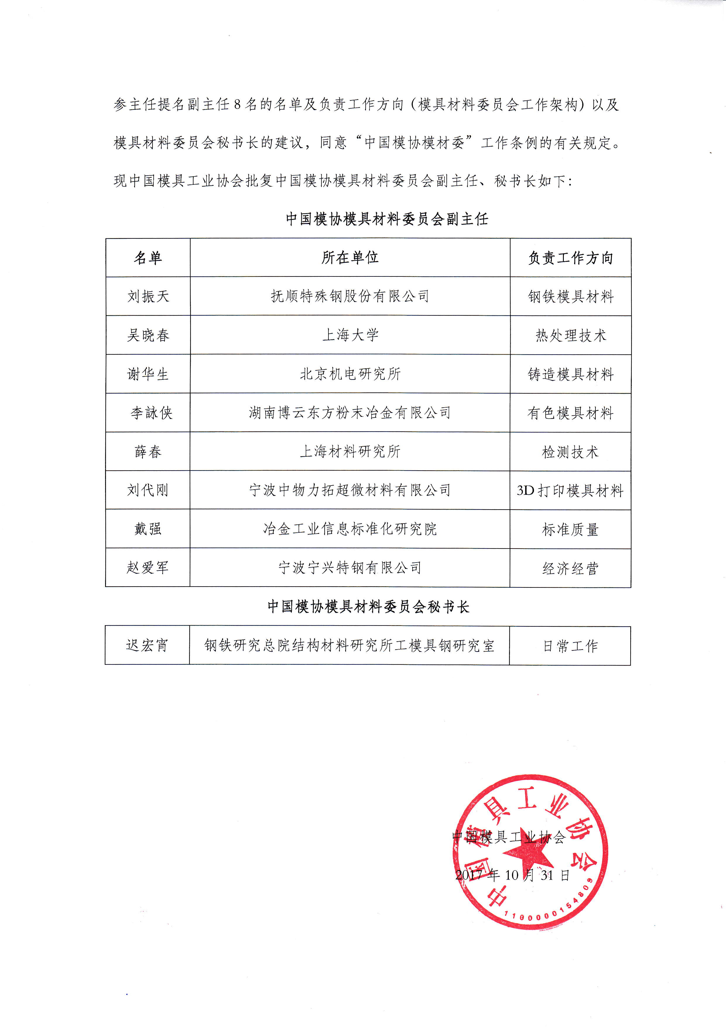 模具材料委员会关于新一届副主任、秘书长组成及工作架构的批复