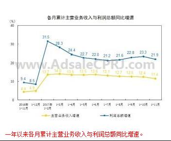 据国家统计局最新统计显示,2017年1~11月中国规模以上工业企业实现主营业务收入108万亿元人民币(下同),同比增长11.4%;实现利润总额68750.1亿元,同比增长21.9%,增速比1-10月份放缓1.4个百分点。发生主营业务成本92.1万亿元,同比增长11.1%。