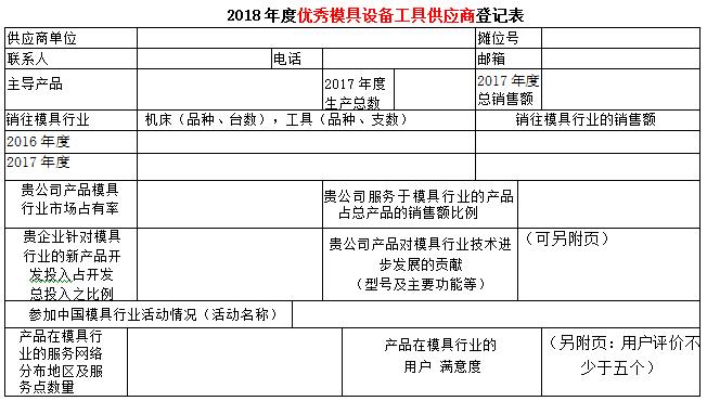 现代模具工业是高技术背景下的资金和技术密集型工业。随着模具行业的发展,现代模具要实现数字化设计、数字化制造、数字化管理、数字化生产流程来实现模具工业的现代化。第十八届中国国际模具技术和设备展览会主办单位之一的中国模具工业协会十分注重展览会内涵,在历届展览会上均开展了对展览会展品的评述工作,至今已成定式。为了更好地为模具企业提供多元服务,为企业的模具设计、加工解决方案提供保障,进一步推动模具及模具相关行业交流与互动,在第十八届中国国际模具技术和设备展览会期间,中国模具工业协会委托中国模具工业协会装备委员会承担优秀模具制造设备供应商评定工作。将本着自愿的原则,依据供应商装备水平,在模具行业服务水平、市场占有率的高低、对模具行业服务满意等行业贡献指标,并结合模具企业的意见开展评定优秀模具制造设备工具供应商,活动不收取参评单位任何费用。现将优秀模具制造设备供应商登记表发给你们,请认真填写,尽快返回中国模具工业协会装备委员会王晓娟 收。
