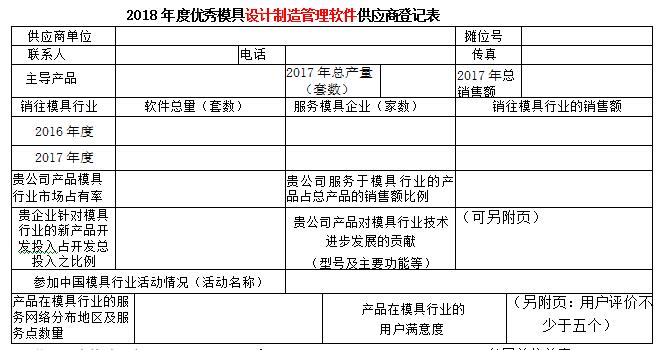 现代模具工业是高技术背景下的资金和技术密集型工业。随着模具行业的发展,现代模具要实现数字化设计、数字化制造、数字化管理、数字化生产流程来实现模具工业的现代化。模具软件是降本提质增效的重要至关领域,为了服务模具企业提高模具软件工具使用效率,提升使用能力,第十八届中国国际模具技术和设备展览会主办单位之一的中国模具工业协会十分注重展览会的内涵,在历届展览会上均开展了对展览会展品的评述工作,至今已成定式。为了更好地为模具企业提供多元的服务,为企业的模具制造加工、集成、协同解决方案提供保障,进一步推动模具及模具相关行业交流与互动,在第十八届中国国际模具技术和设备展览会期间,中国模具工业协会委托中国模具工业协会数字化信息化委员会(数信委),本着自愿的原则,依据供应商软件水平,在模具行业服务能能力、市场占有率的高低、对模具行业服务满意等行业贡献指标,并结合模具企业的意见开展评定优秀模具设计制造管理软件供应商活动,活动不收取参评单位任何费用。现将优秀模具设计制造管理软件供应商登记表发给你们,请予认真填写, 尽快返回中国模具工业协会数字化信息化委员会 魏青收。