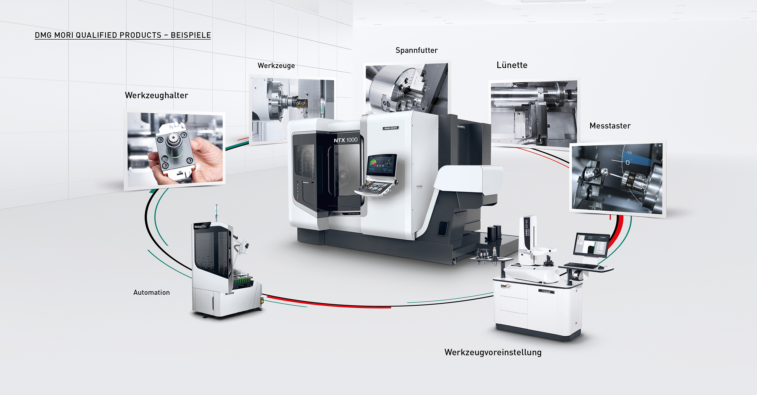 DMG MORI的生产解决方案包括外部供应商提供的测量设备、刀柄和夹持系统等辅助设备和配件。这些设备和产品为高质量数控机床而设计制造。DMG MORI认证产品(DMQP)是高质量的代表。认证条件包括产品的内部认证、价格稳定性和相应的质保条件。