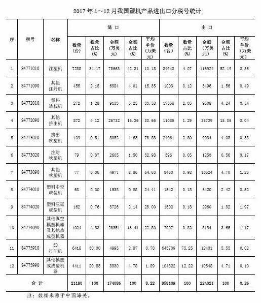 2017年,中国进口塑料机械21180台,进口金额约17.41亿美元,进口数量同比下降25%,进口金额同比增长30%。进口平均单价由去年同期的5万美元/台增长至8万美元/台。