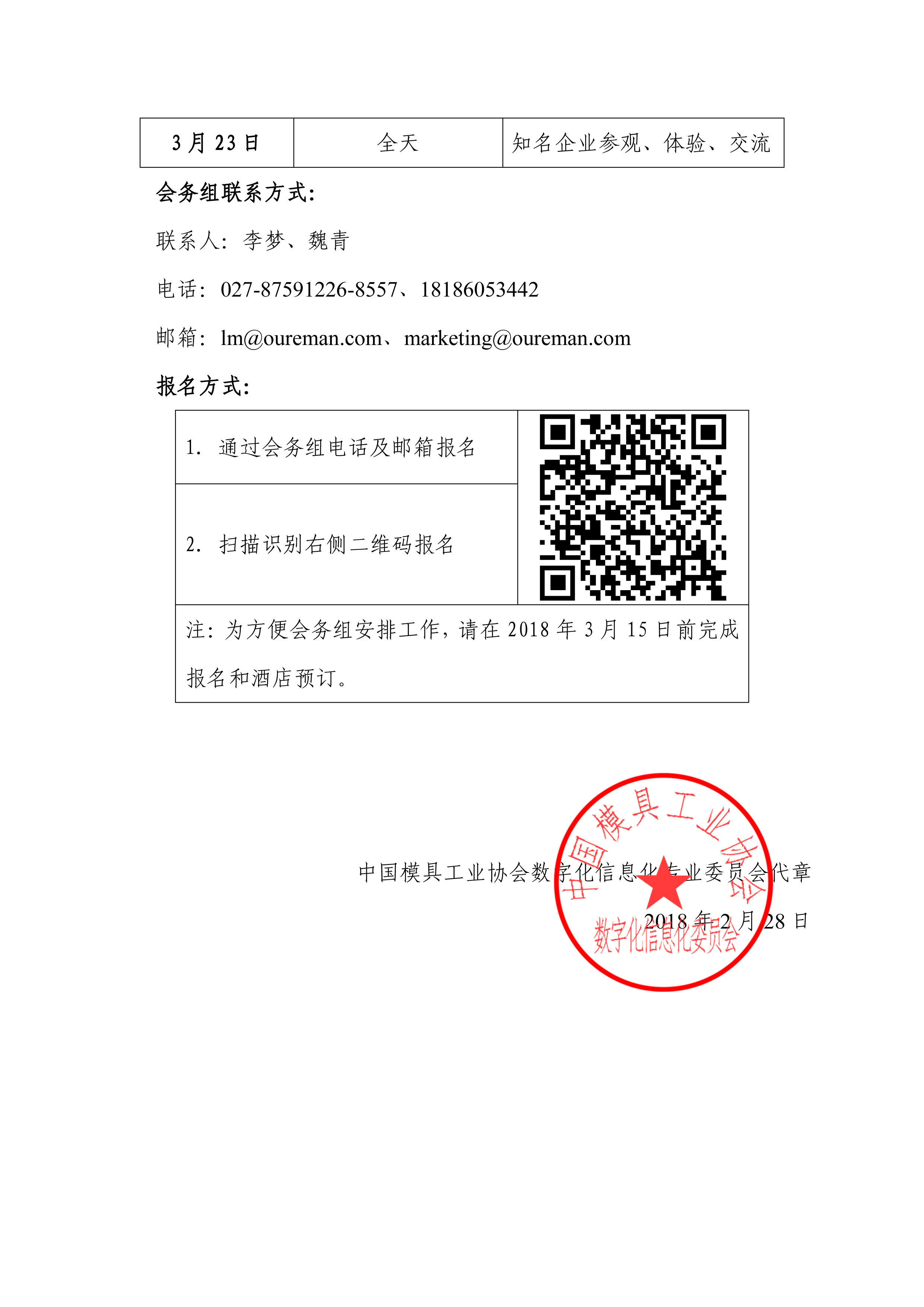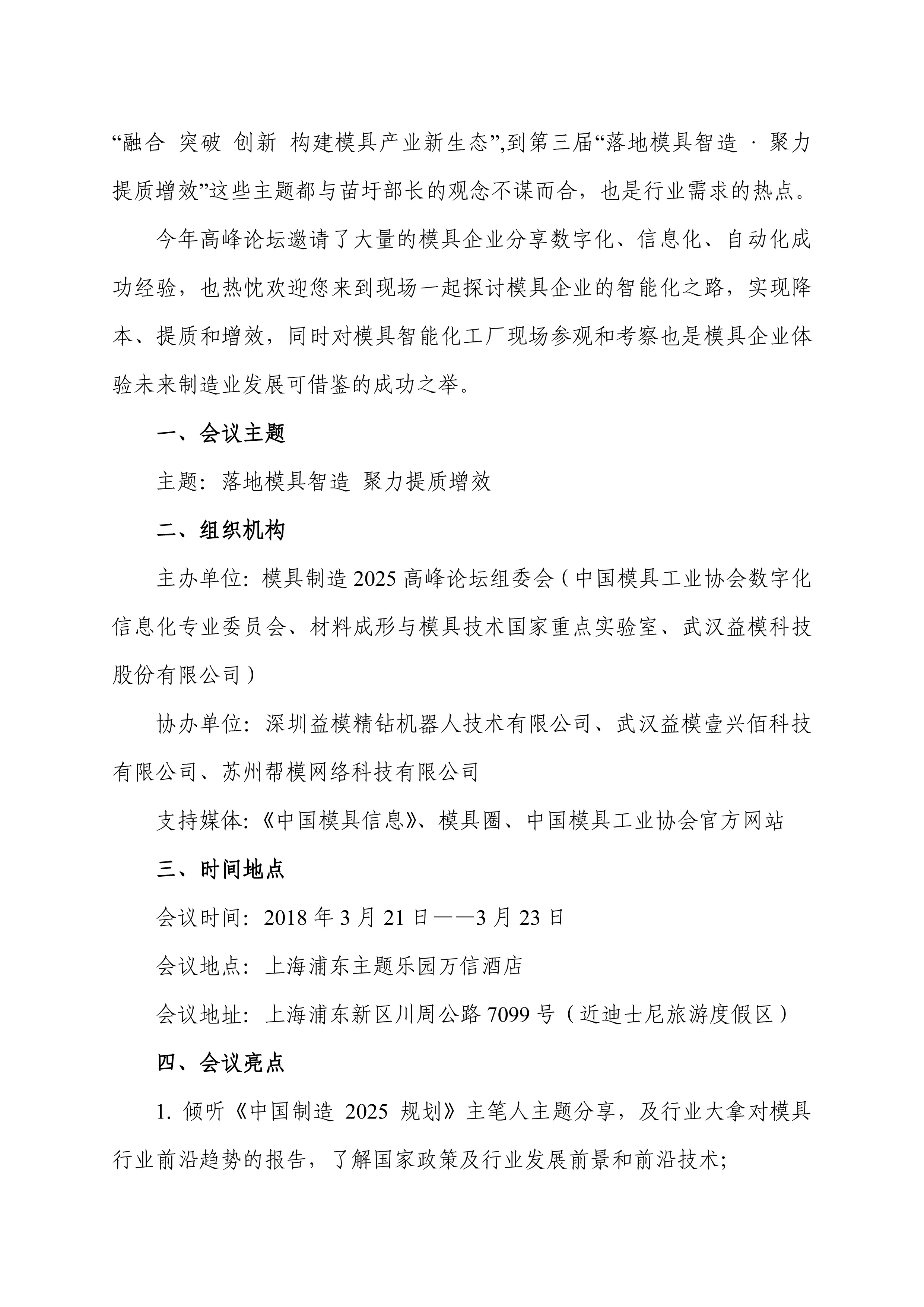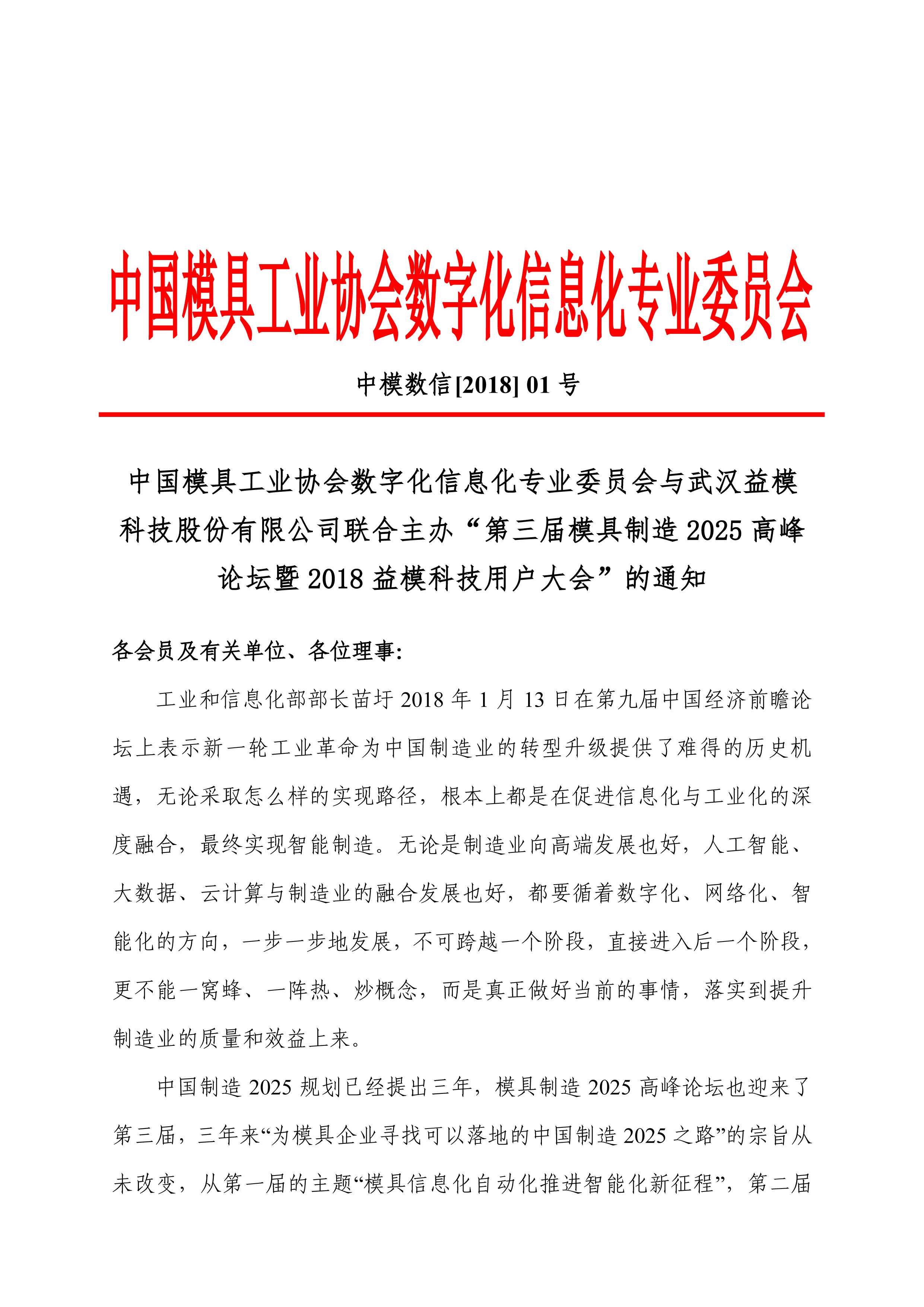中国模具工业协会数字化信息化专业委员会与武汉益模科技股份有限公司联合主办“第三届模具制造2025高峰论坛暨2018益模科技用户大会”的通知