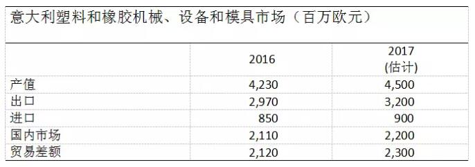根据意大利塑料橡胶加工机械和模具行业协会(Amaplast)研究中心对2017年1-9月ISTAT外贸数据的分析,与2016年同期相比,进口增长12%,出口增长16%。贸易顺差增幅超过17亿欧元,增加了17个百分点。