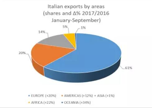 大陆的份额已增长到近61%,其中欧盟占总量的50%。欧洲(+ 20%)的强劲表现归因于,意大利制造商3个传统市场—德国(+ 25%)、西班牙(+ 11%)和法国(+ 15%)的销售量大幅增加。