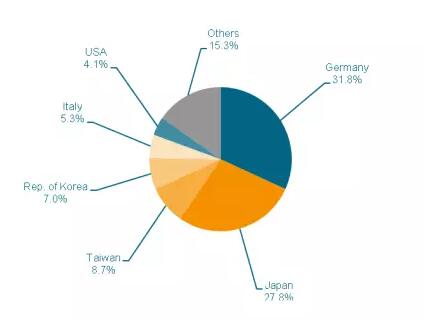 根据德国机械设备制造业联合会(VDMA)、德国国家统计局统计的52个报告国家的出口数据,2016年全球塑料和橡胶机械向中国的供应量达到19.7亿欧元,与上年相比下降了7.1%。德国在全球对华出口中排名第一,占31.8%,其次是日本(27.8%)、台湾(8.7%)和韩国(7.0%)。