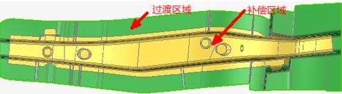 方案一:只补偿拉延工序,补偿区域如图8所示,型面划分为补偿区域、过渡区域和固定区域。先尝试用1作为补偿系数,对比补偿迭代两次的结果如图9所示,由回弹结果对比可知,迭代第一次、迭代第二次的回弹结果相比产品原来的回弹均有所改善,在零件前端区域和法兰区域的回弹值还是比较大,且第二次迭代结果整体上比第一次的结果稍差,补偿效果不太理想。