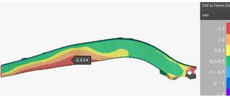 (2)根据零件的特点和前期CAE分析得出的回弹结果,制定合理的回弹补偿方案,并运用CAE反向回弹补偿技术对模具型面进行补偿,补偿后CAE验证回弹均在要求的+-0.5mm之内,有效的解决高强度钢板回弹大的问题;