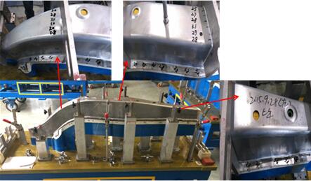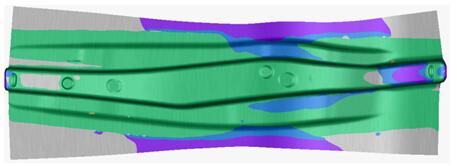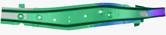 将模具进行装配、调试后,生产的零件在检具上检测状态如图16所示,由图知该样件无起皱和开裂现象,几个关键部位的尺寸精度检测均合格,合格率达92.64%,满足装车要求。