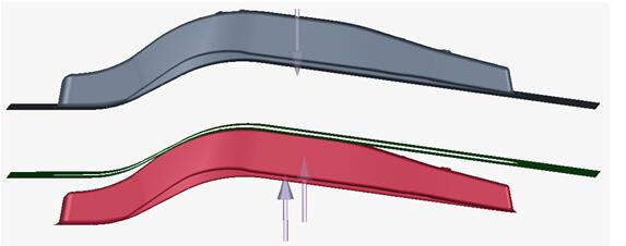 回弹补偿原理[8]:利用有限元数值模拟计算回弹,然后在预估有回弹的区域作出反方向的补偿值,使零件成形后的反弹正好与补偿值抵消,从而得到合格产品。