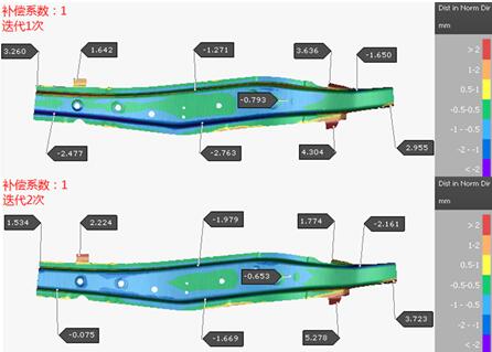 再次尝试进行补偿系数为0.8的补偿,其补偿后的回弹结果如图10所示,由回弹补偿的结果可知,两次迭代的补偿效果均比补偿系数为1的效果好,但是零件的法兰区域的回弹还是较大,还需要改善。再尝试用补偿系数为0.9、1.1和1.2来进行补偿,补偿效果均不如补偿系数为0.8的,所以最终确定选用0.8作为最佳的补偿系数来进行其它方案的补偿。
