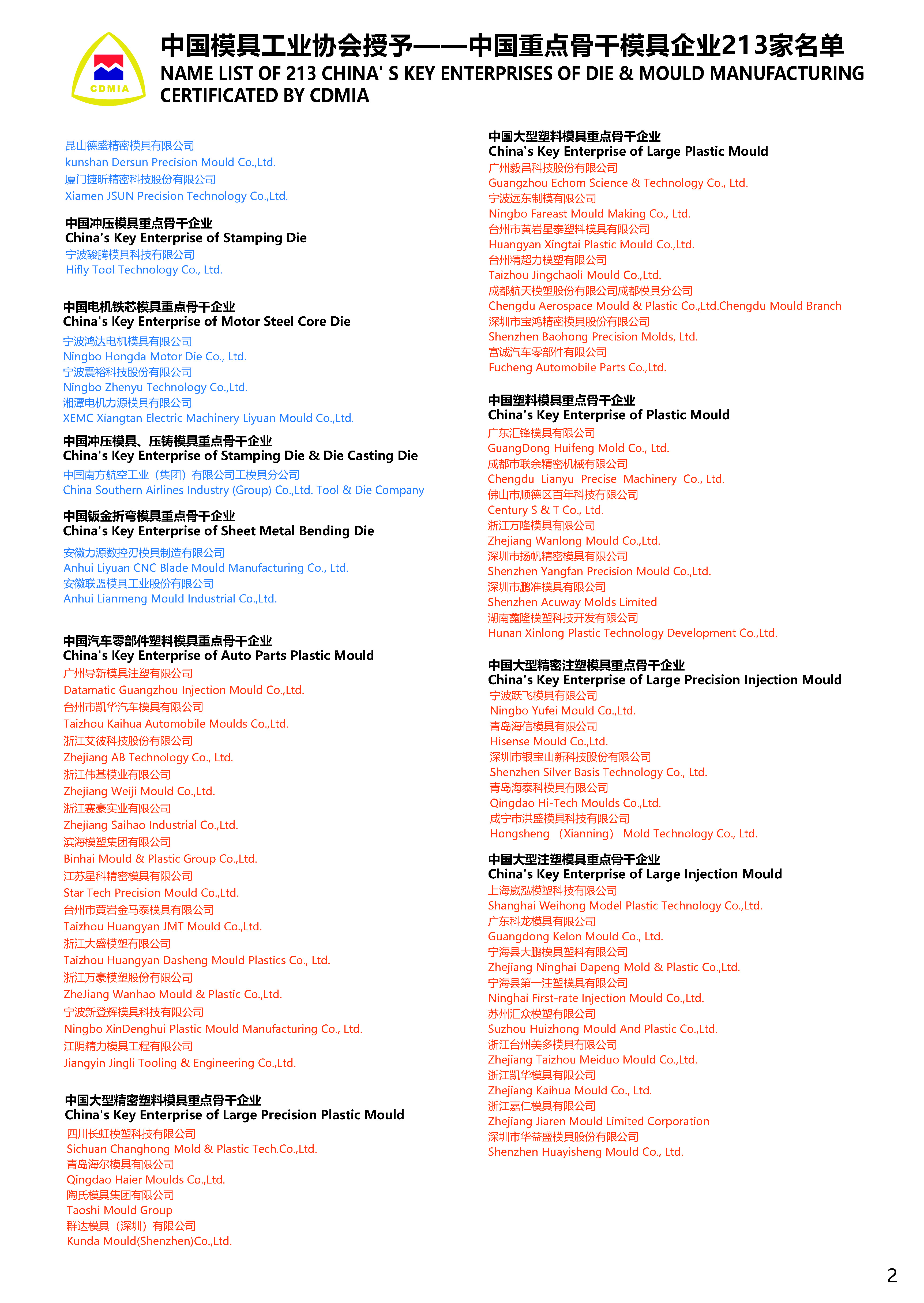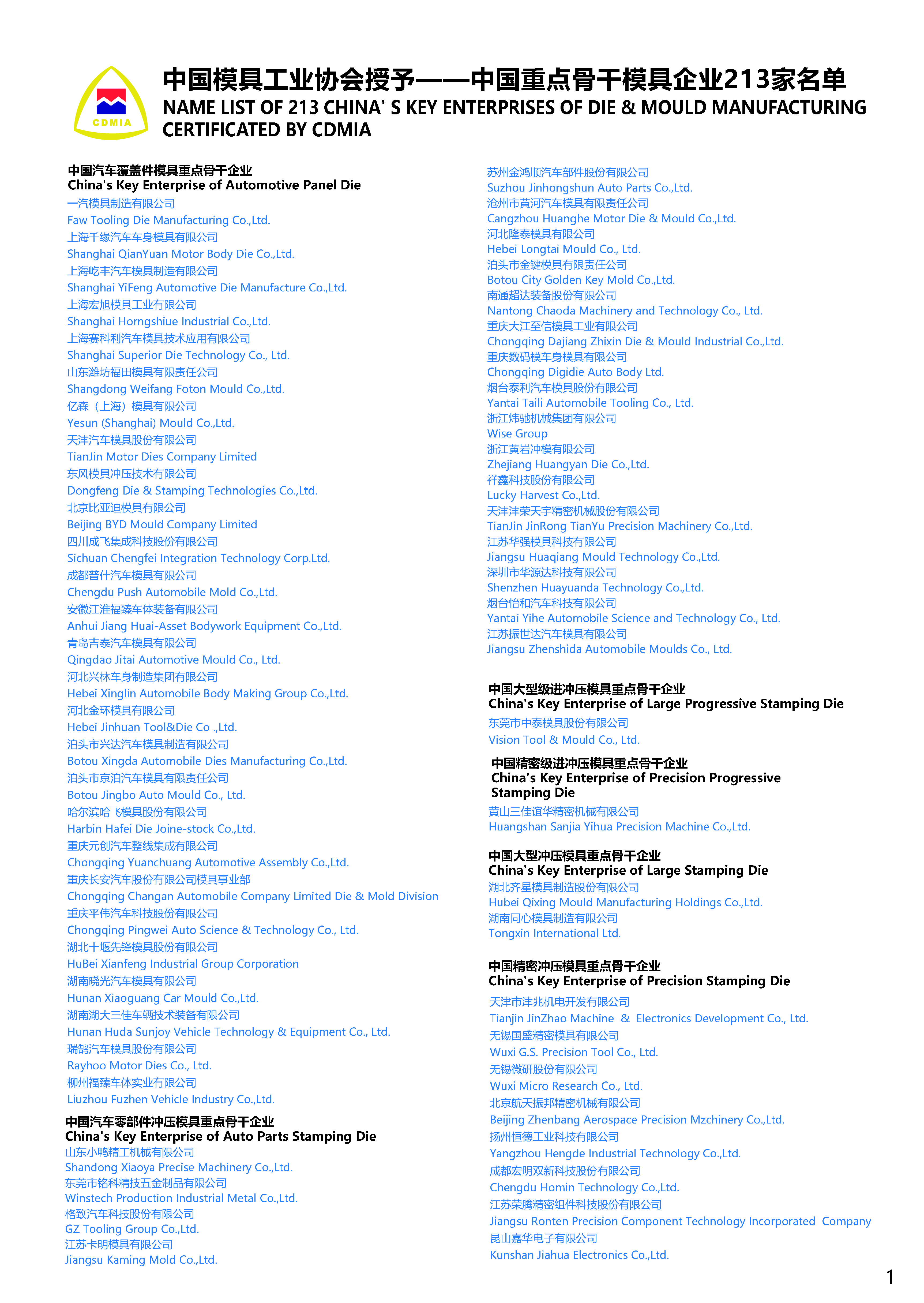 China‘s Key Enterprises of Die & Mould Manufacturing Certificated by CDMIA