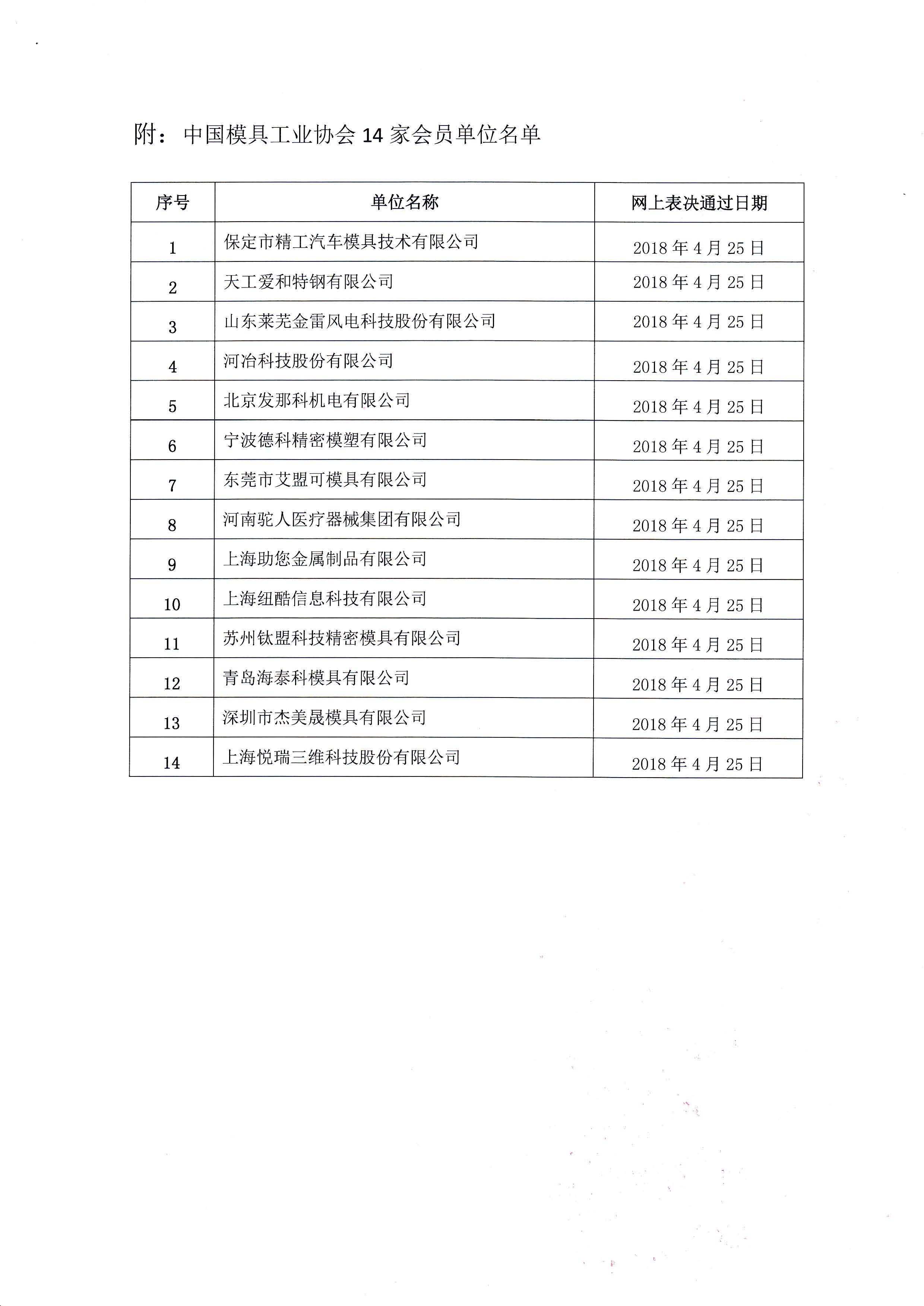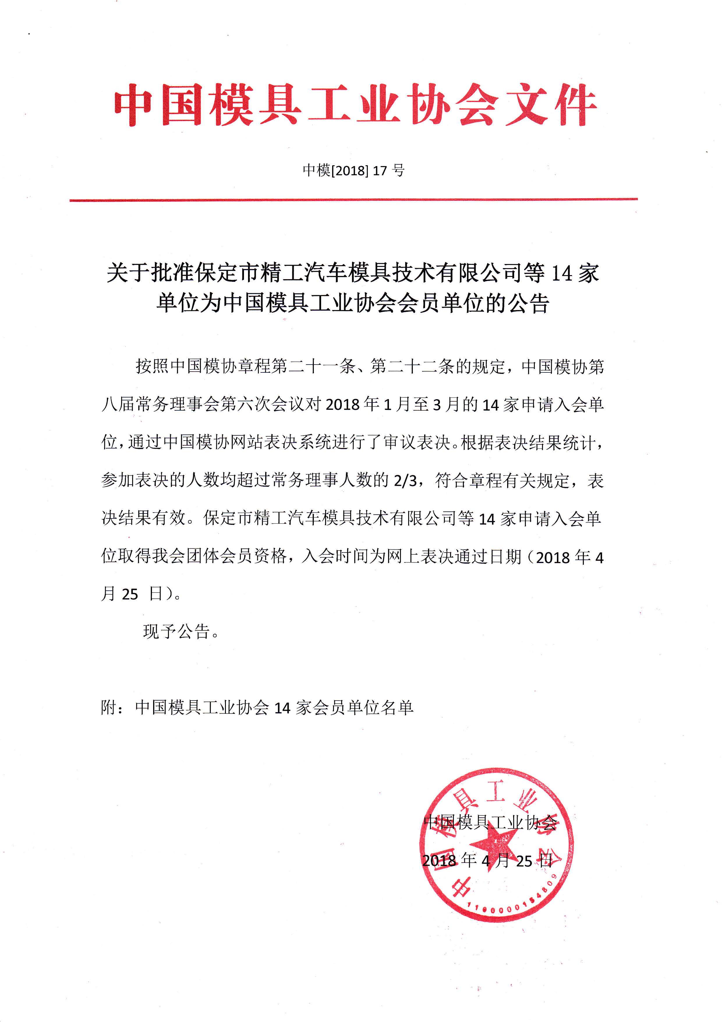 关于批准保定市精工汽车模具技术有限公司等14家单位为中国模具工业协会会员单位的公告