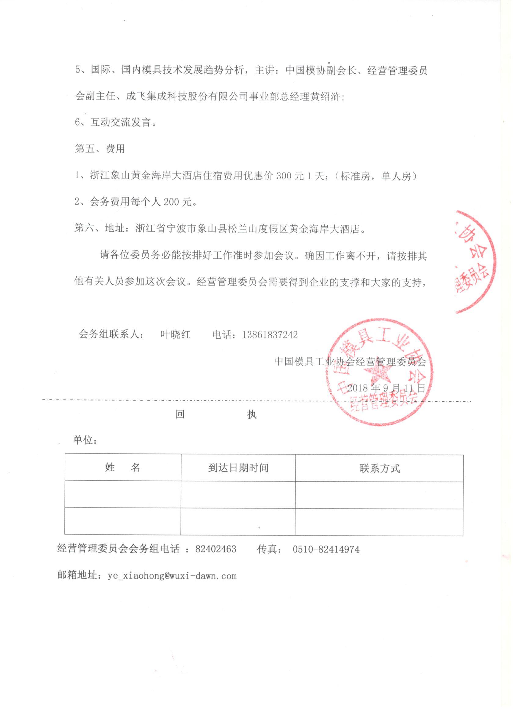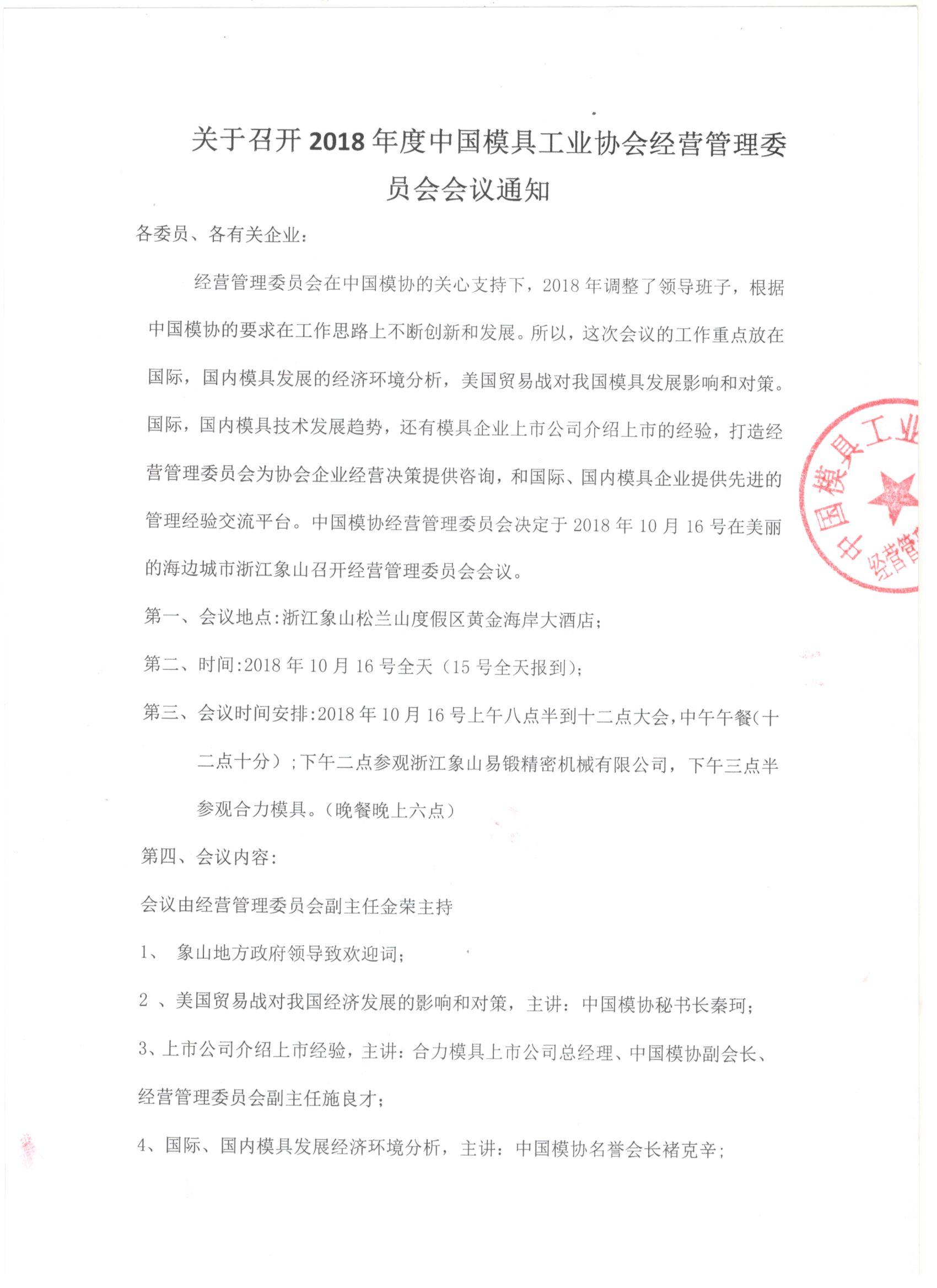 关于召开2018年度中国模具工业协会经营管理委员会会议通知