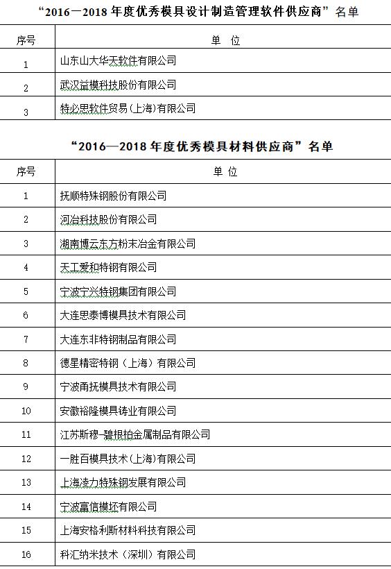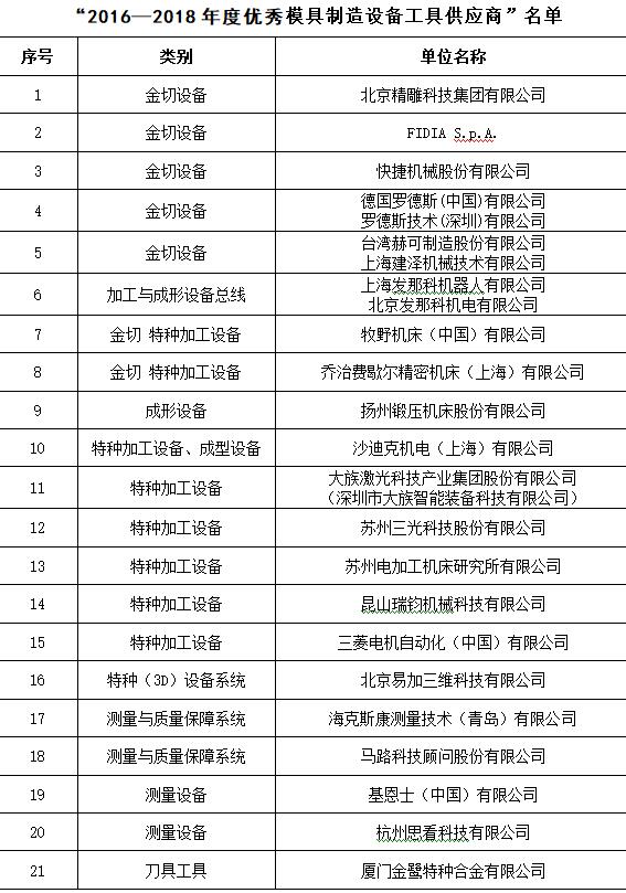 在知名品牌专业展会——中国国际模具技术和设备展览会DMC上开展优秀供应商的评选活动,得到了各行业的广泛认可,被评定为优秀供应商的企业,将在模具企业的采购中获得优先推荐资格并在行业里得到广泛的宣传推广,并在中国模协的官网上进行公告,至今已成定式。DMC2018期间,中国模具工业协会委托中国模协装备委员会、数字化信息化委员会、材料委员会,本着自愿的原则,依据供应商的技术水平、在模具行业的服务能力、市场占有率的高低、模具行业服务满意度等行业贡献指标,并结合模具企业的意见,最终评选出21家“2016—2018年度优秀模具制造设备工具供应商”、3家“2016—2018年度优秀模具设计制造管理软件供应商”、16家“2016—2018年度优秀模具材料供应商”(同时见www.cdmia.com.cn,diemouldchina.com.cn),具体名单如下所示,排名均不分先后。