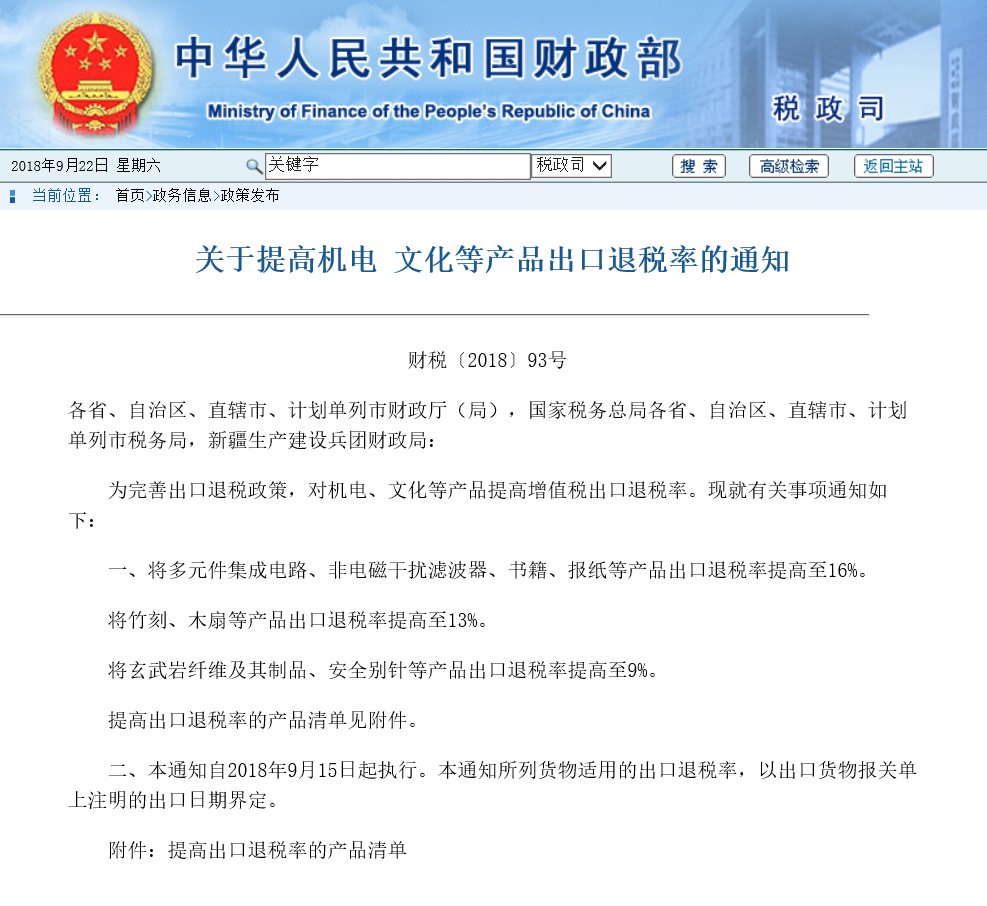 中华人民共和国财政部官网发布的《关于提高机电 文化等产品出口退税率的通知》财税(2018)93号 中所列产品从