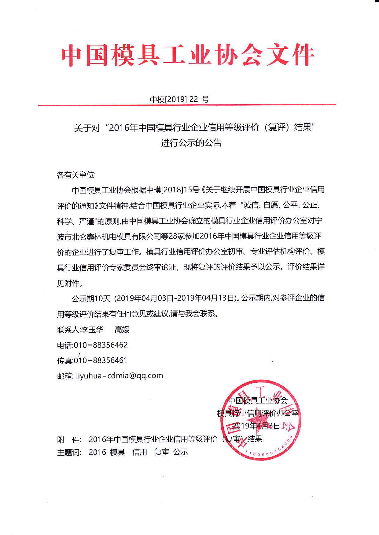 关于对“2016年中国模具行业企业信用等级评价(复评)结果”进行公示的公告