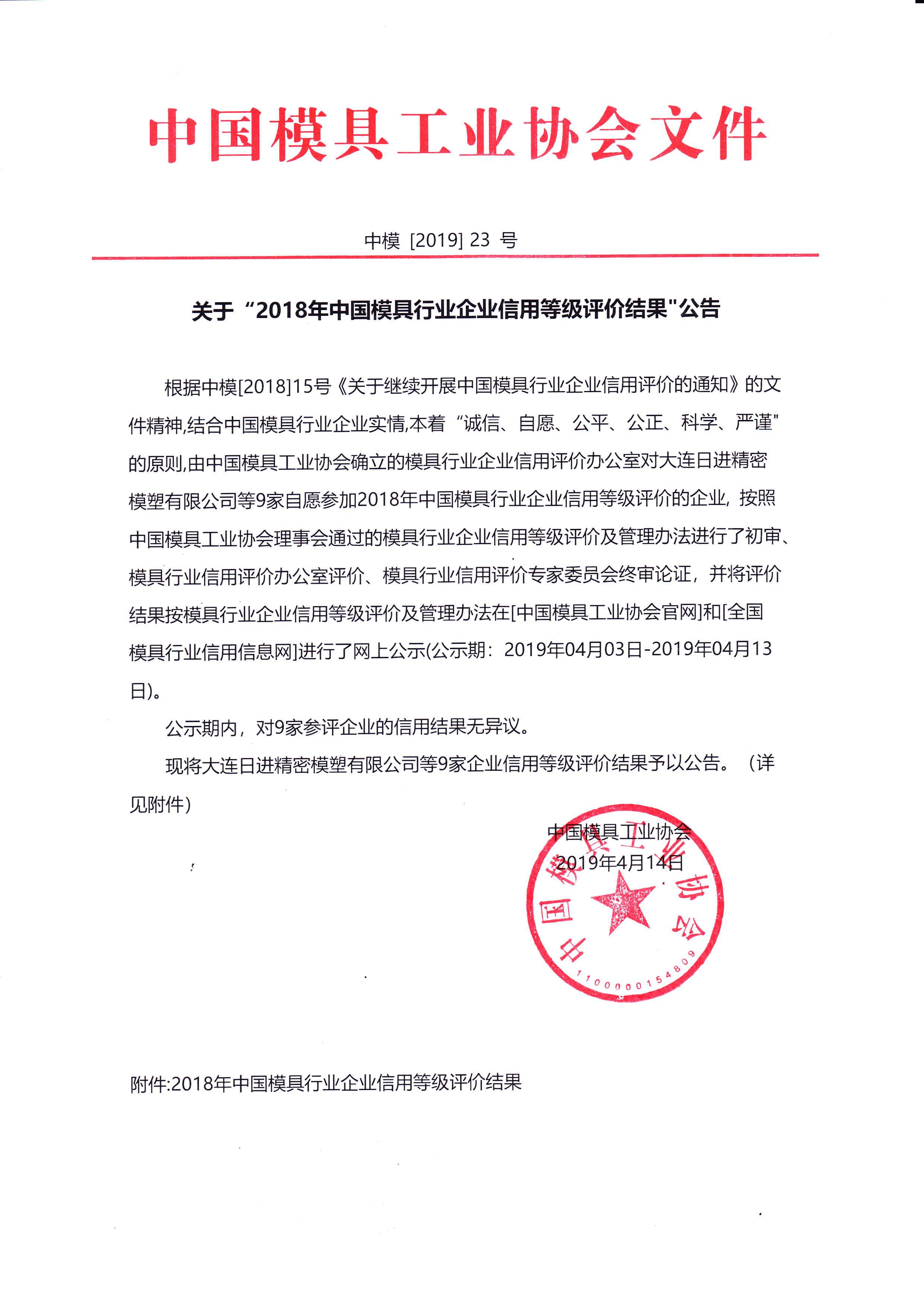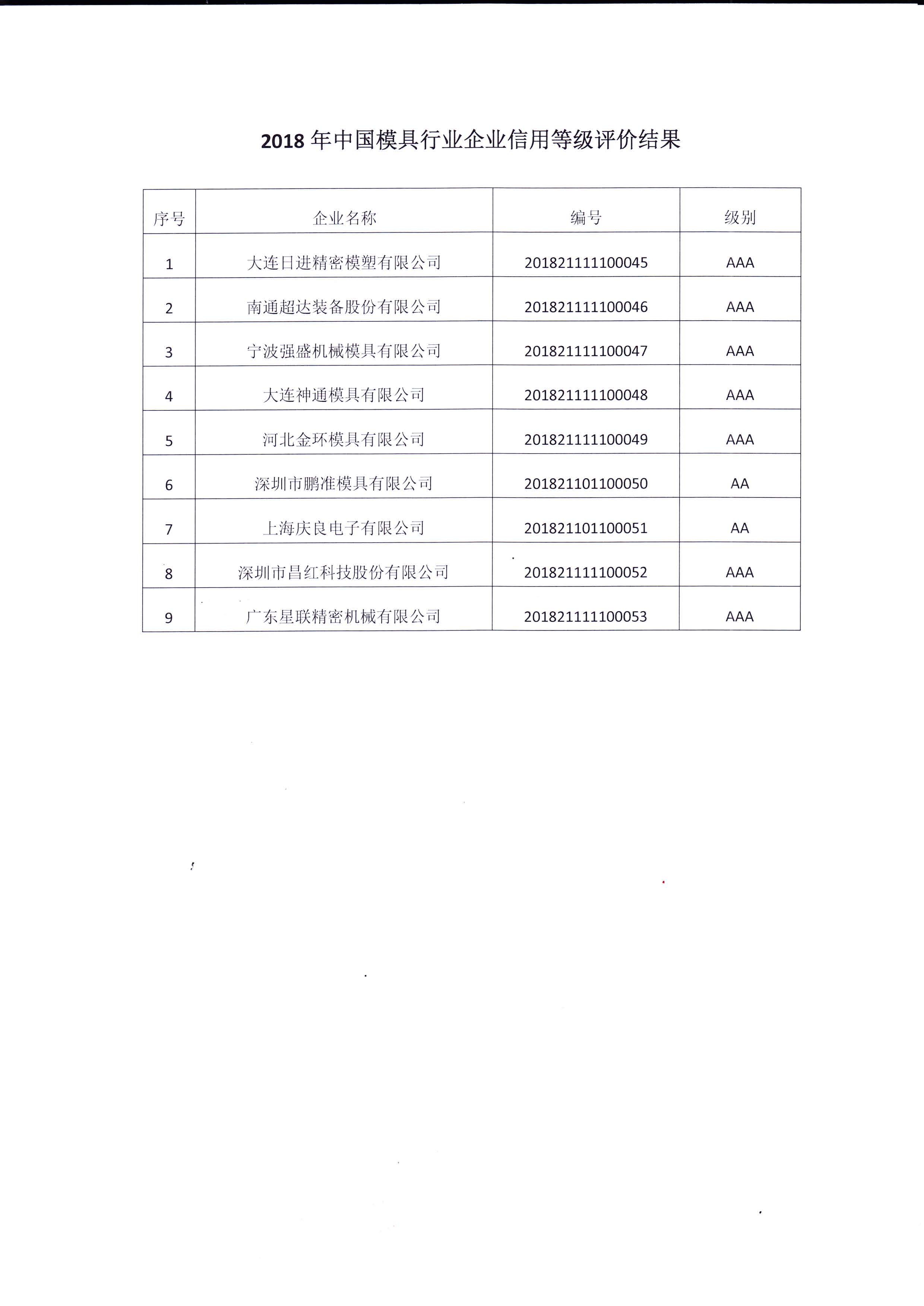 关于“2018年中国模具行业企业信用等级评价结果”公告