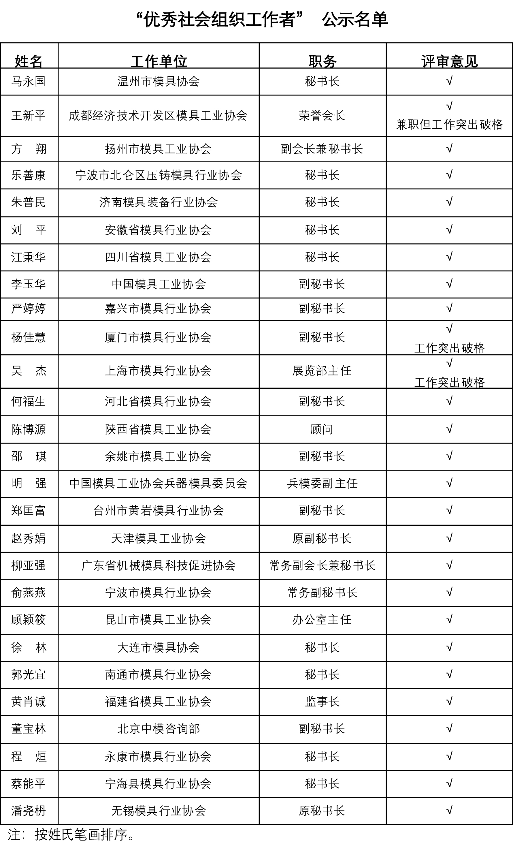 依据“优秀社会组织工作者”评选方案,中国模协在模具行业协(学)会中开展“优秀社会组织工作者”评选活动。按照程序,各地方协(学)会,根据 “优秀社会组织工作者”推荐条件,推荐本地区的候选人名单;按“优秀社会组织工作者”评选办法,中国模协秘书处对候选人材料进行初审、汇总,由中国模协常务理事、理事中产生的评选工作组评选;由中国模协驻会会长、部分副会长、秘书长、常务理事代表组成的评选领导小组核准确认。经过充分评选,确定的27 名“优秀社会组织工作者” 评选结果,在中国模具工业协会官网公示如下,公示期2019年11月8日-14日。