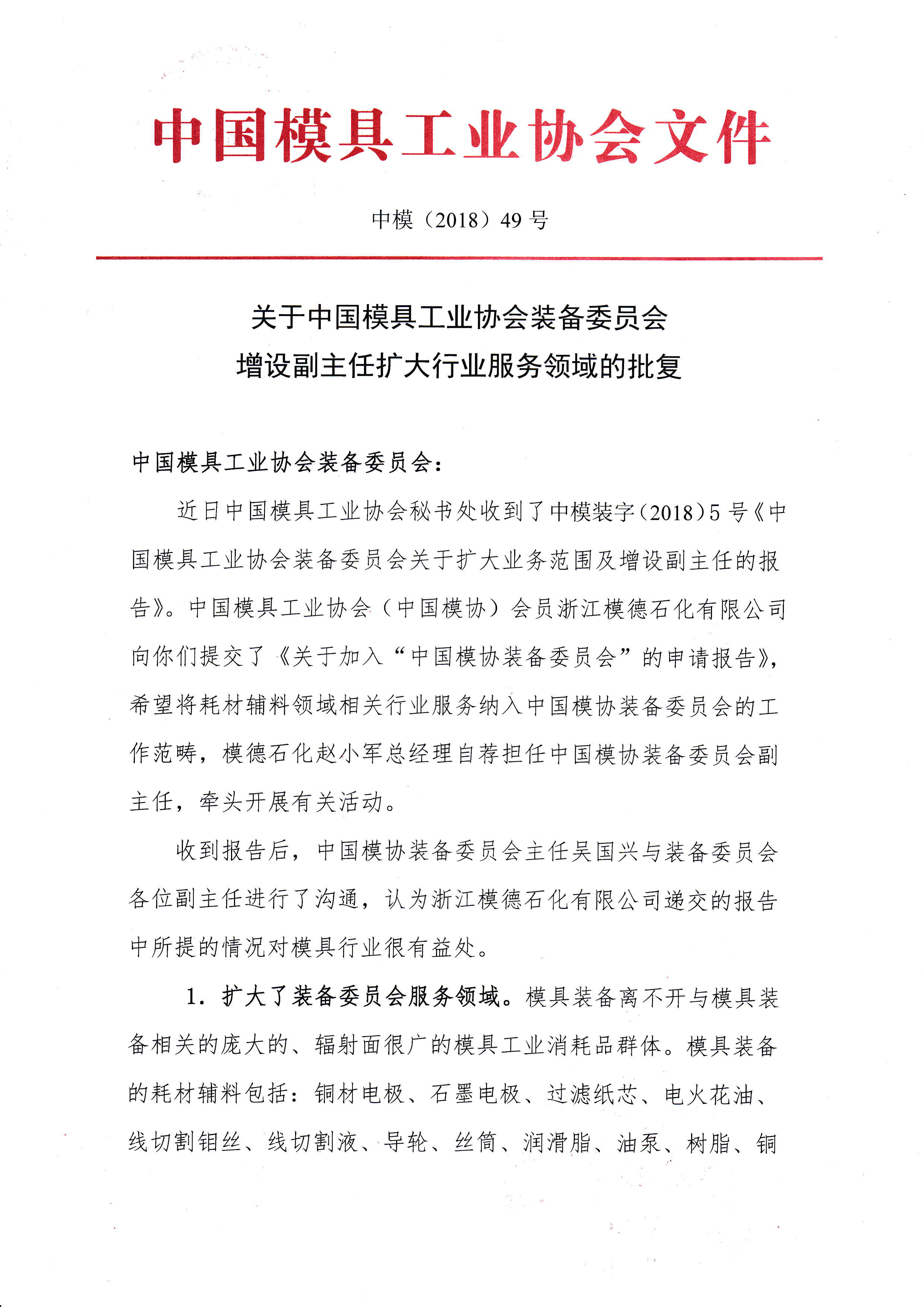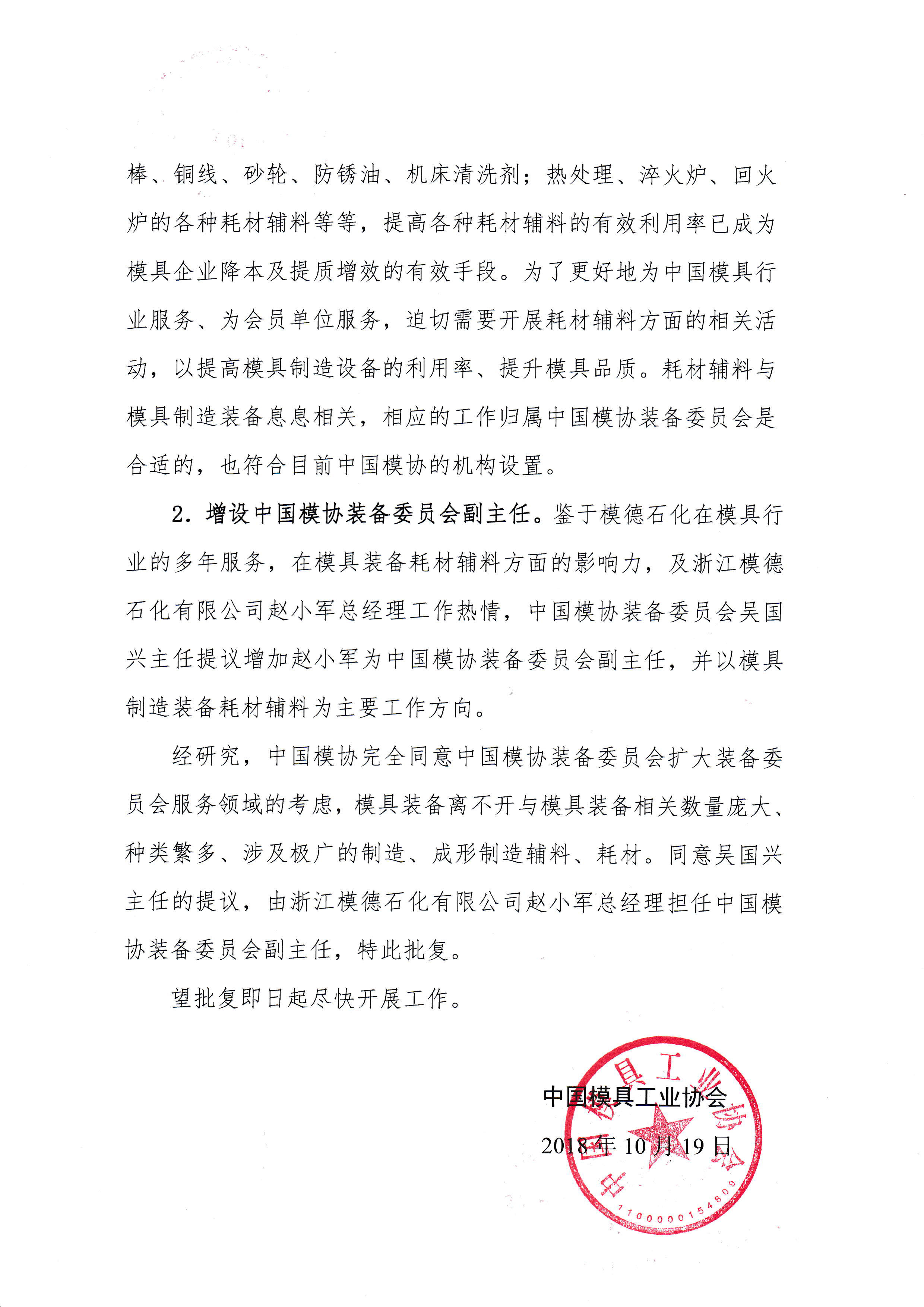 关于中国模具工业协会装备委员会增设副主任扩大行业服务领域的批复