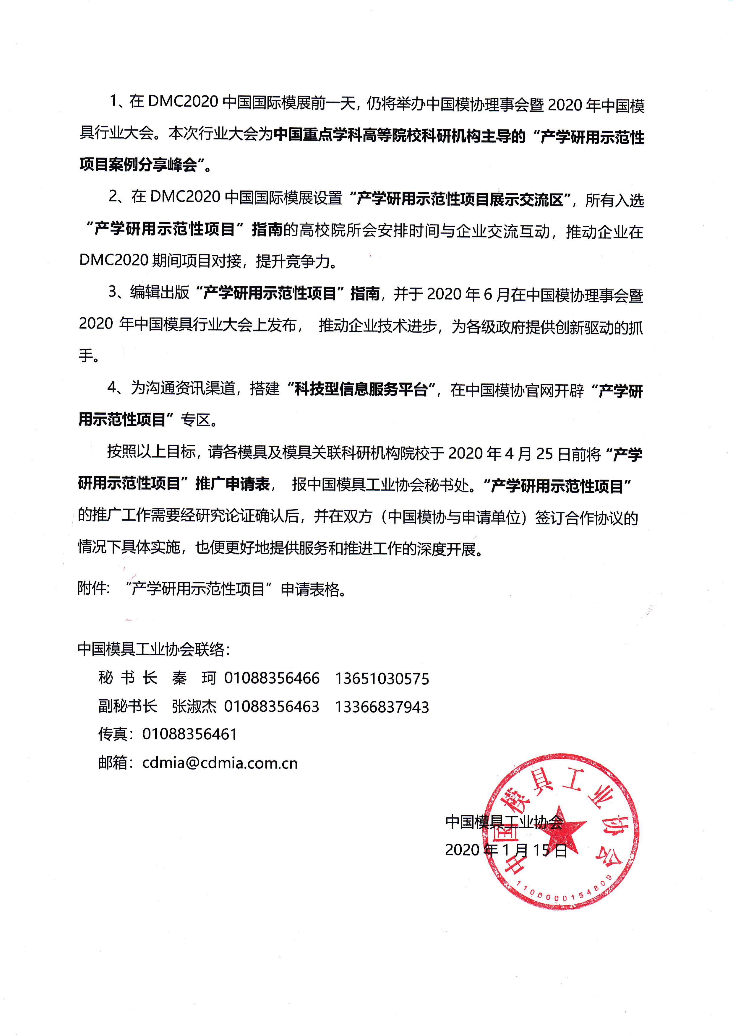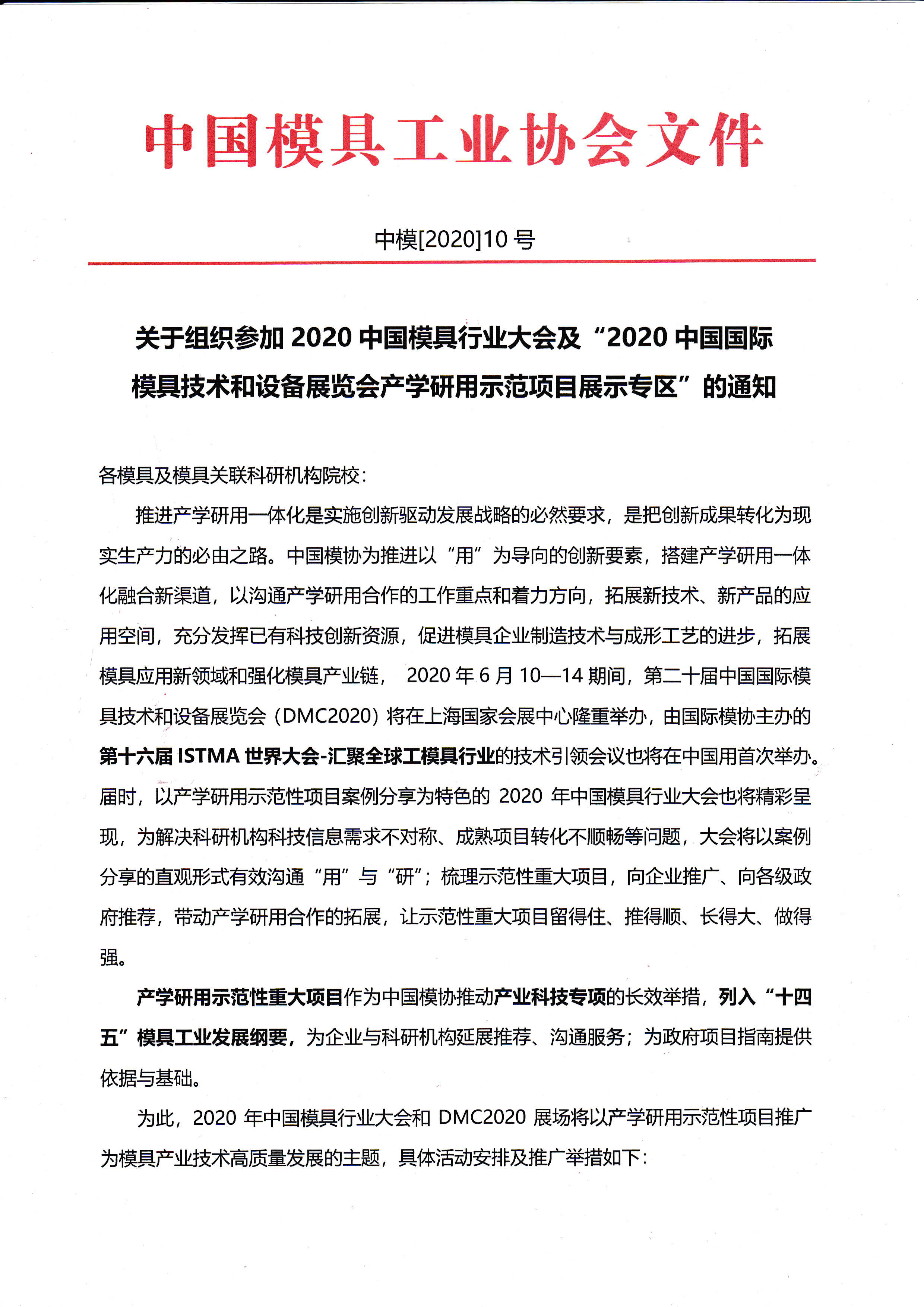 关于组织参加2020中国模具行业大会及“2020中国国际模具技术和设备展览会产学研用示范项目展示专区”的通知