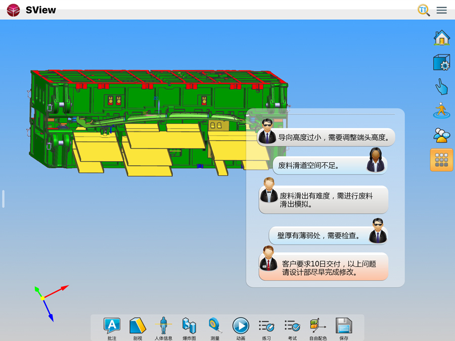 一个模具企业的新产品协同评审会议中,通过视频、语音、文本交流对模具的零件表面缺陷、结构可靠性、工艺性进行分析,模具设计人员可以实时记录各方评审意见,方便完善模具3D设计。最后在SView协同会议中还可以进行会签,确认相应责任。