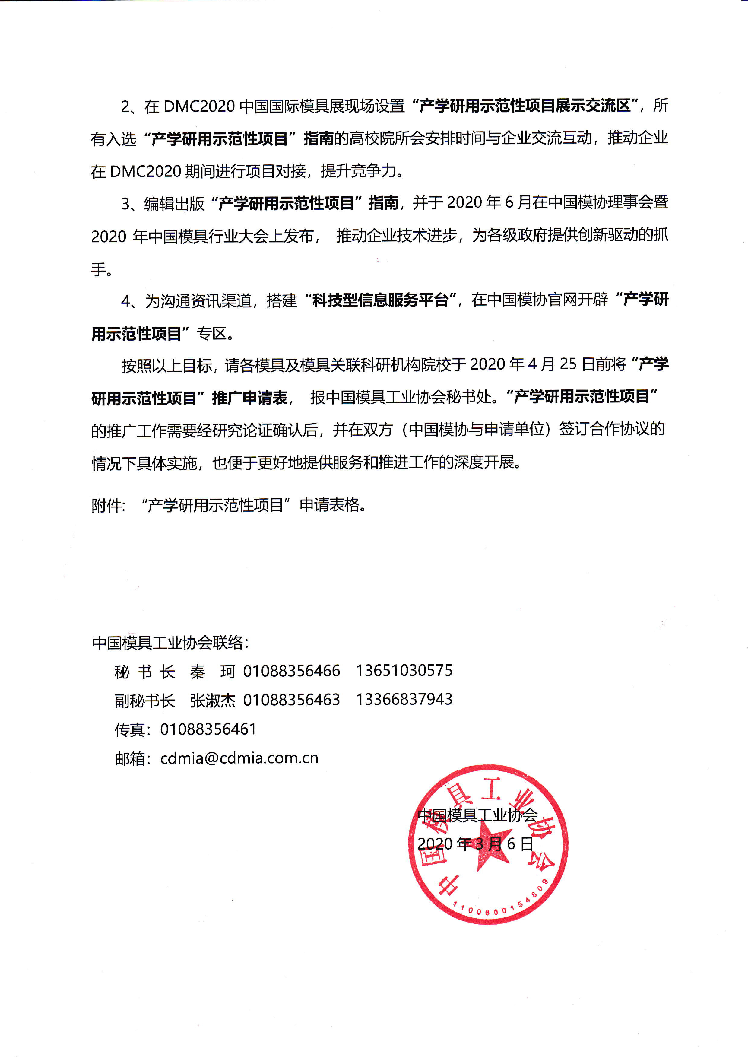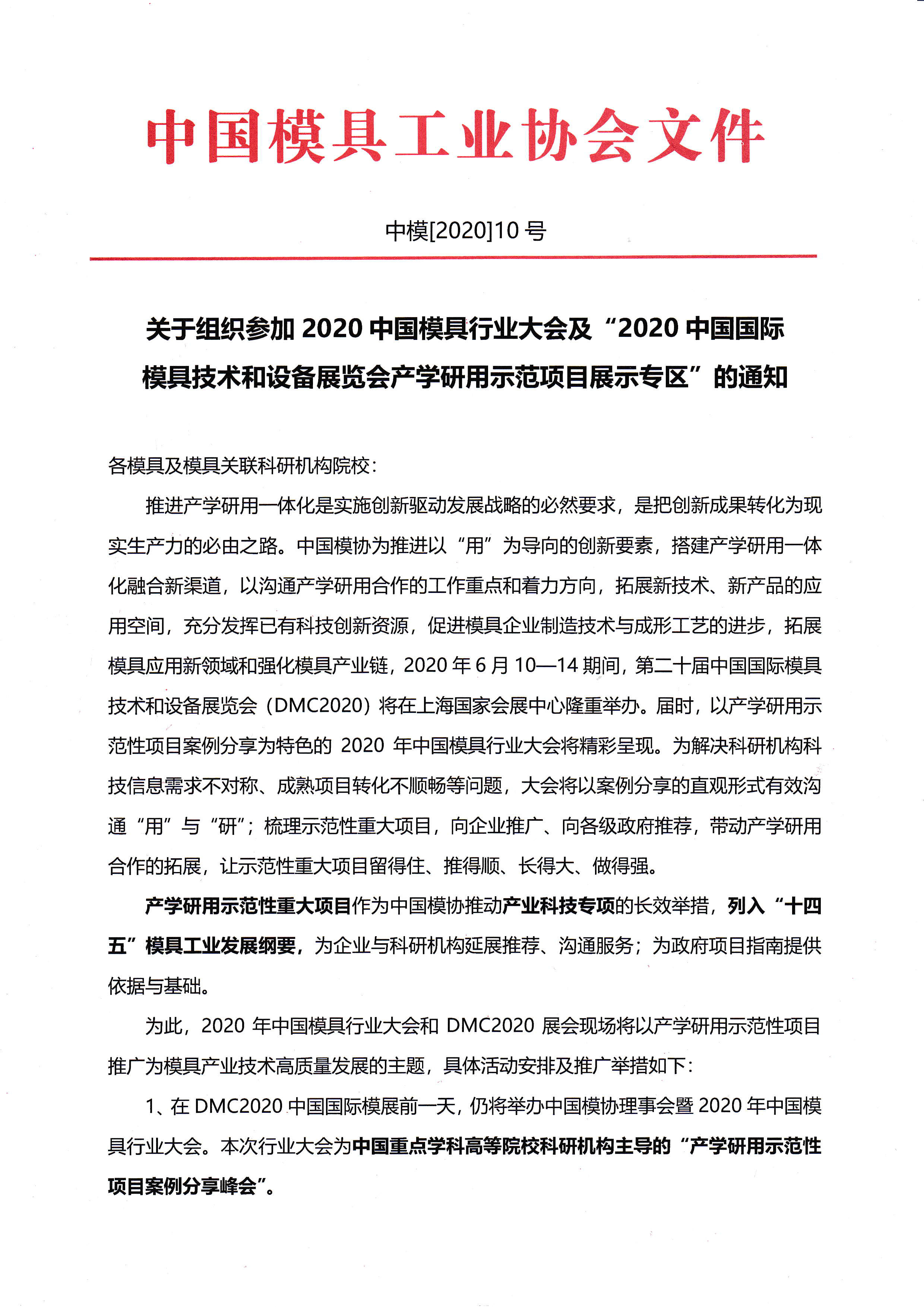 关于组织参加2020中国模具行业大会及“2020中国国际模具技术和设备展览会产学研用示范项目展示专区”的通知