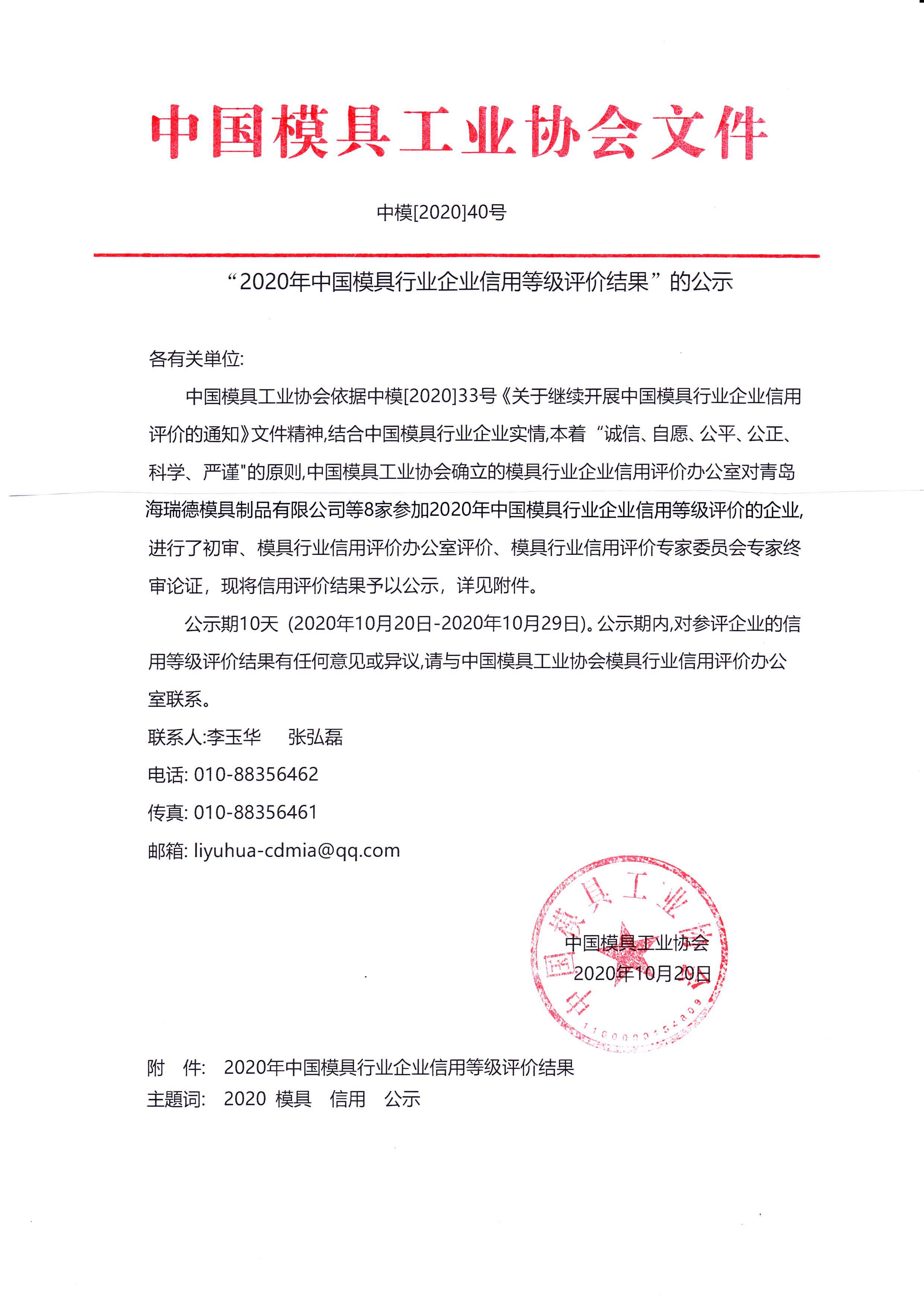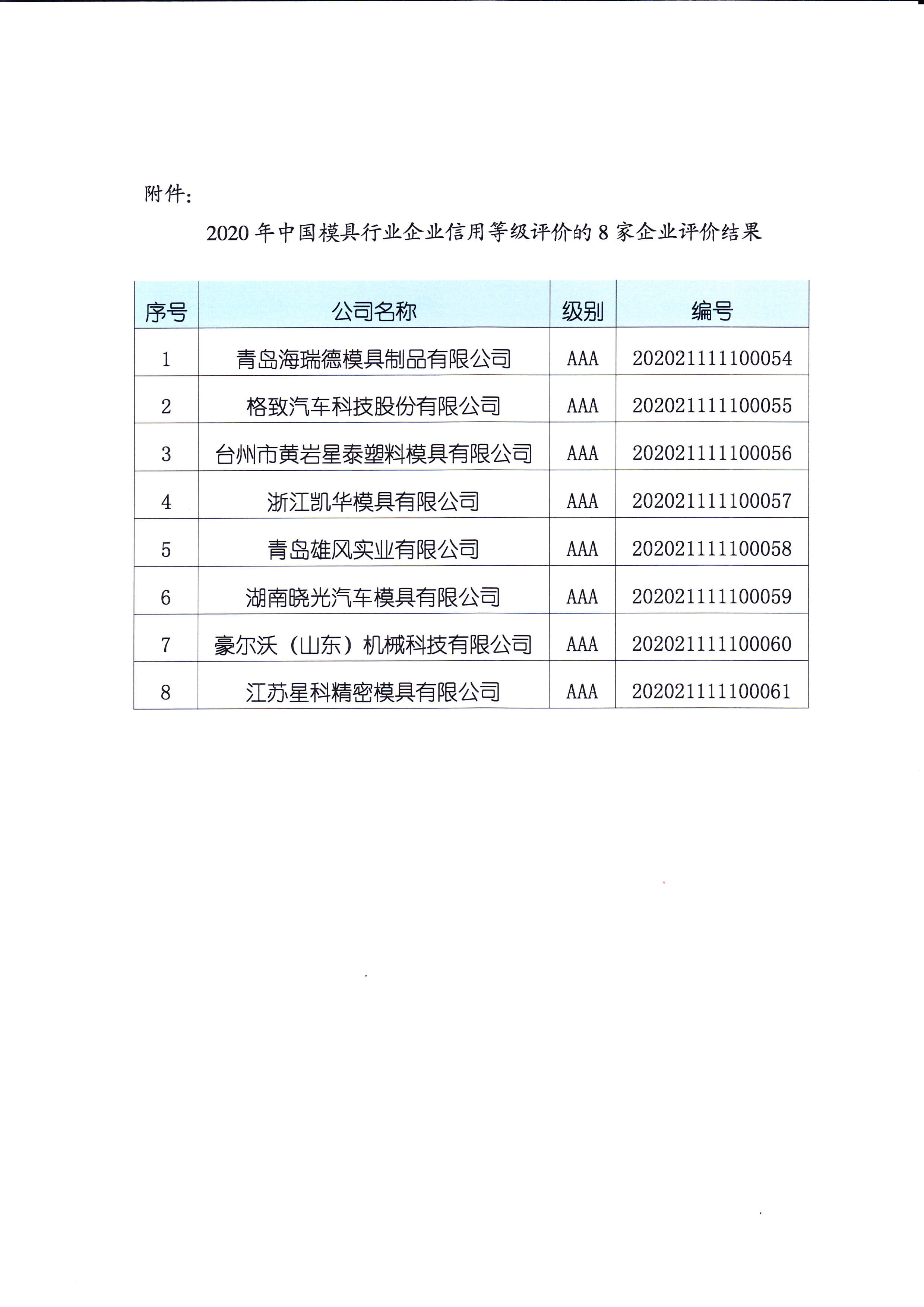 “2020年中国模具行业企业信用等级评价结果”的公示