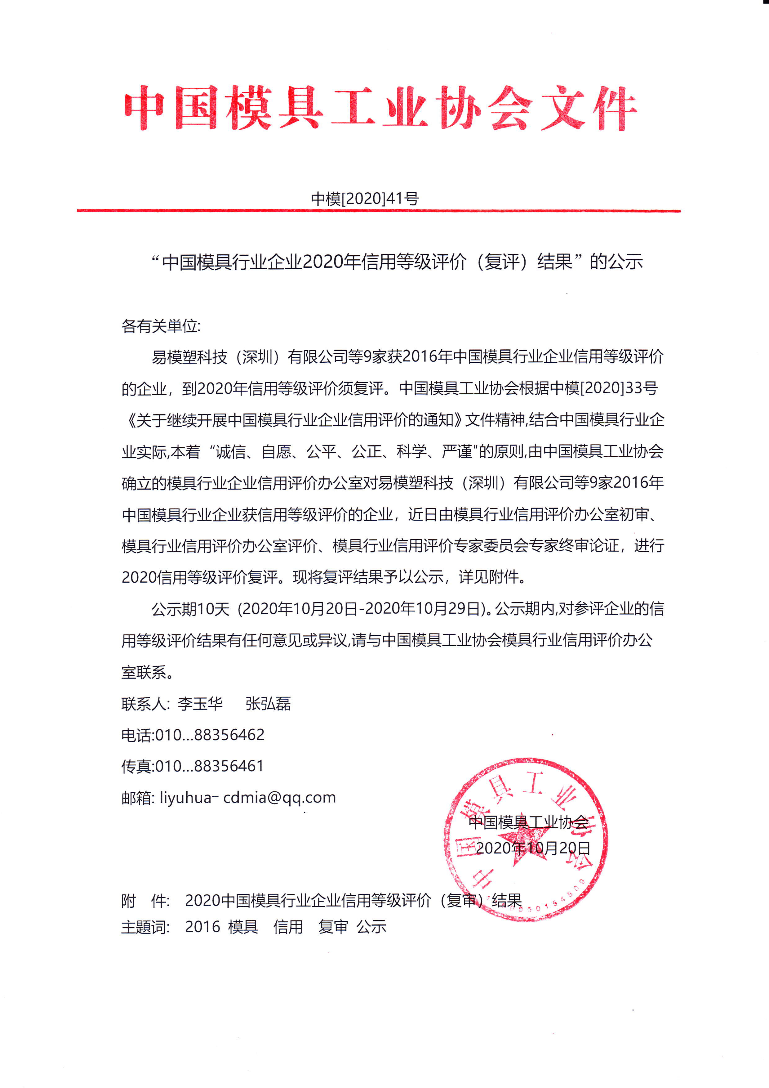 “中国模具行业企业2020年信用等级评价(复评)结果”的公示