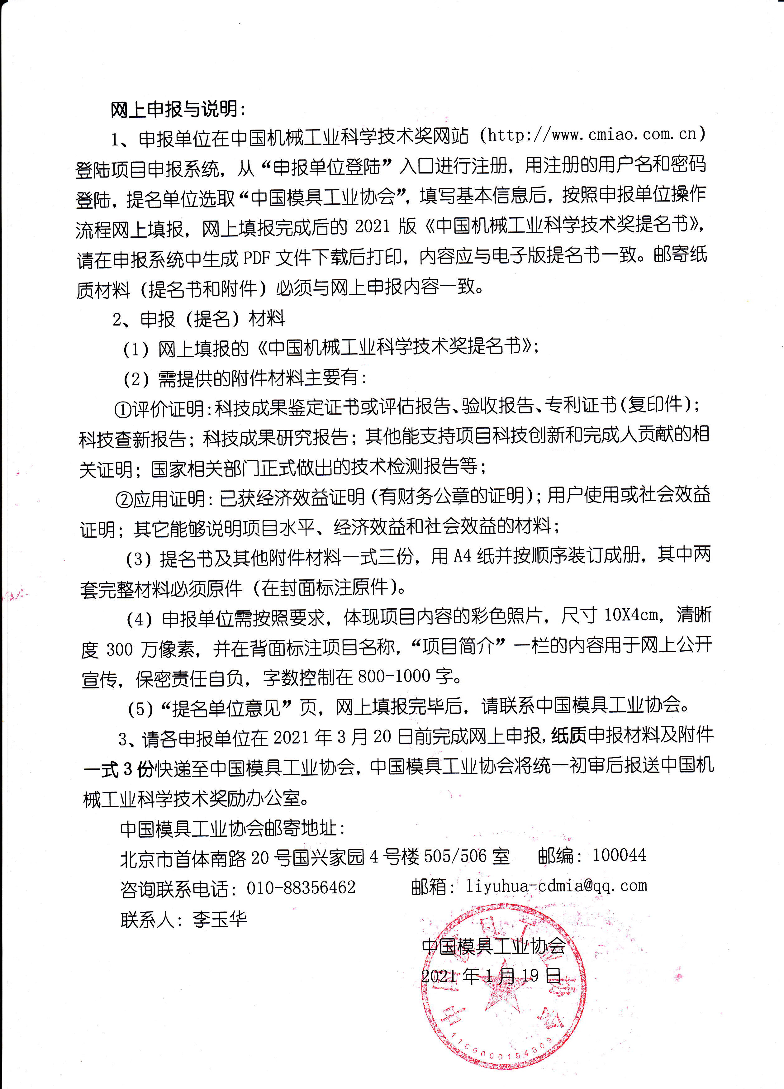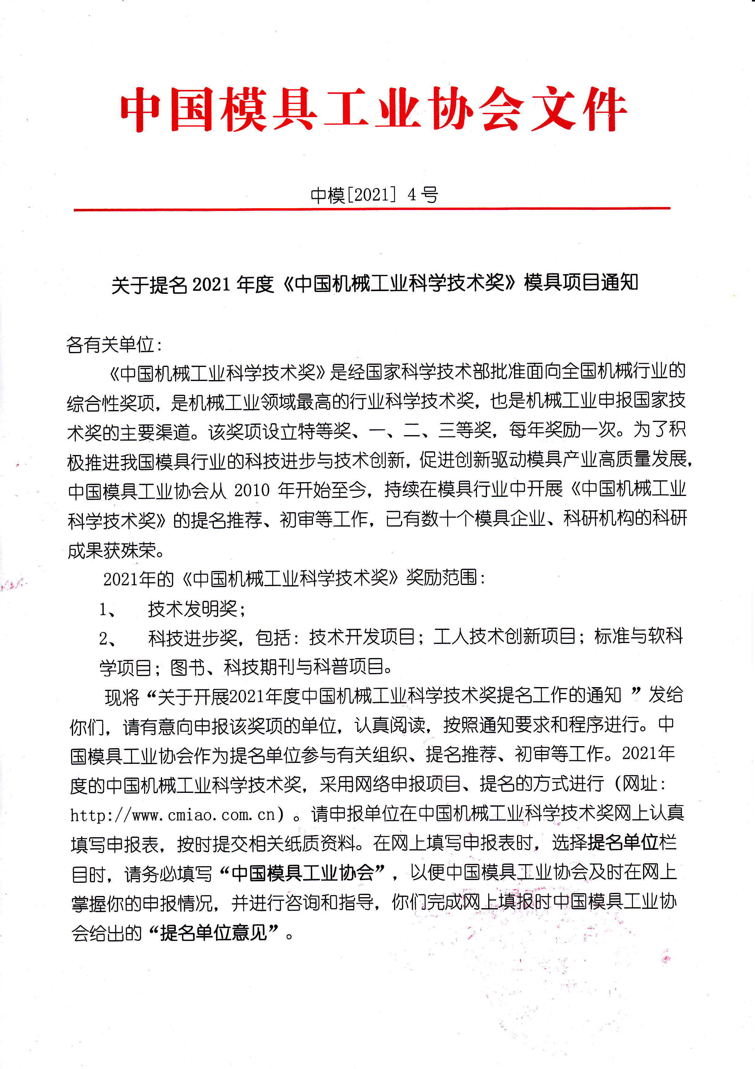 关于提名2021年度《中国机械工业科学技术奖》模具项目通知