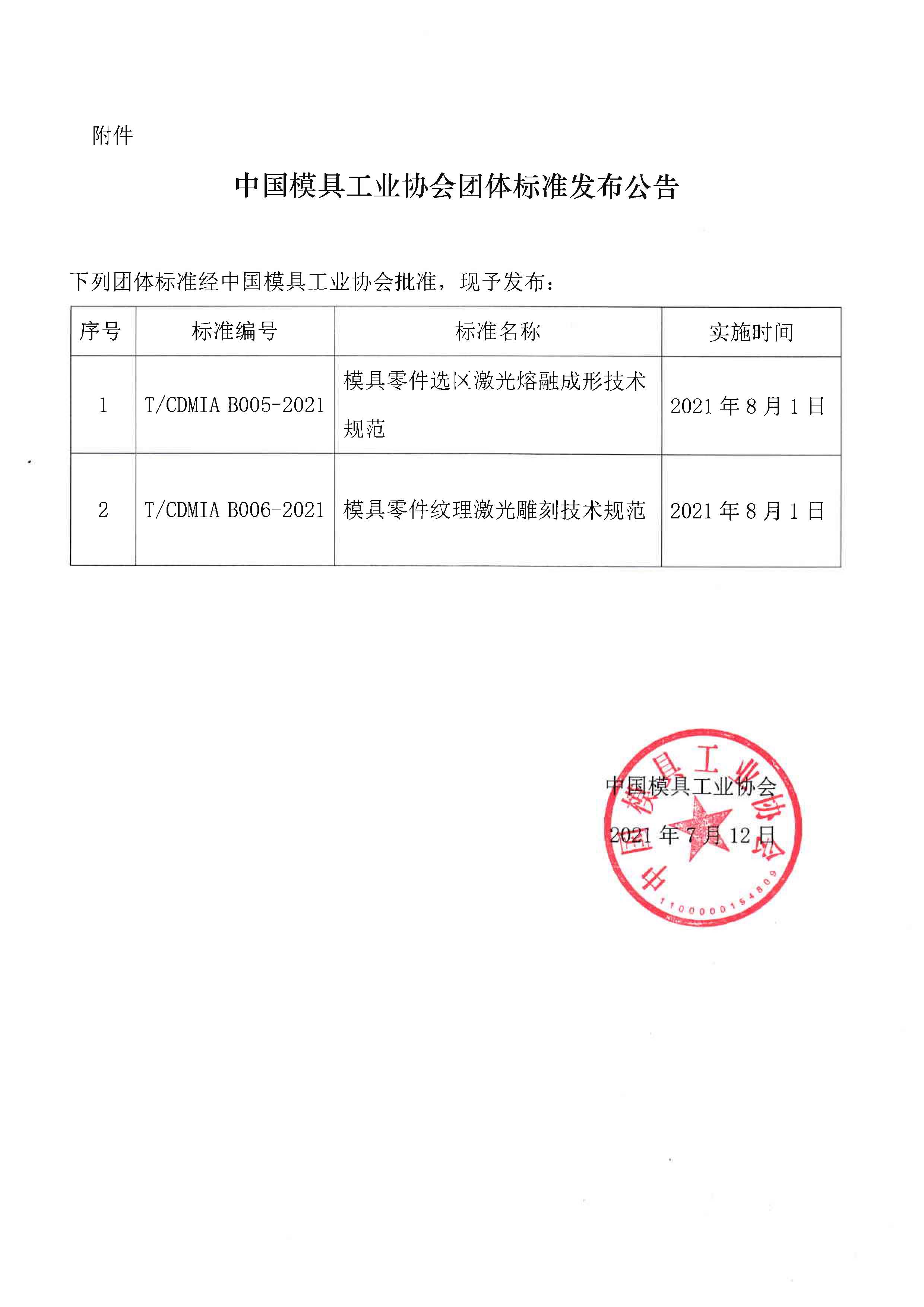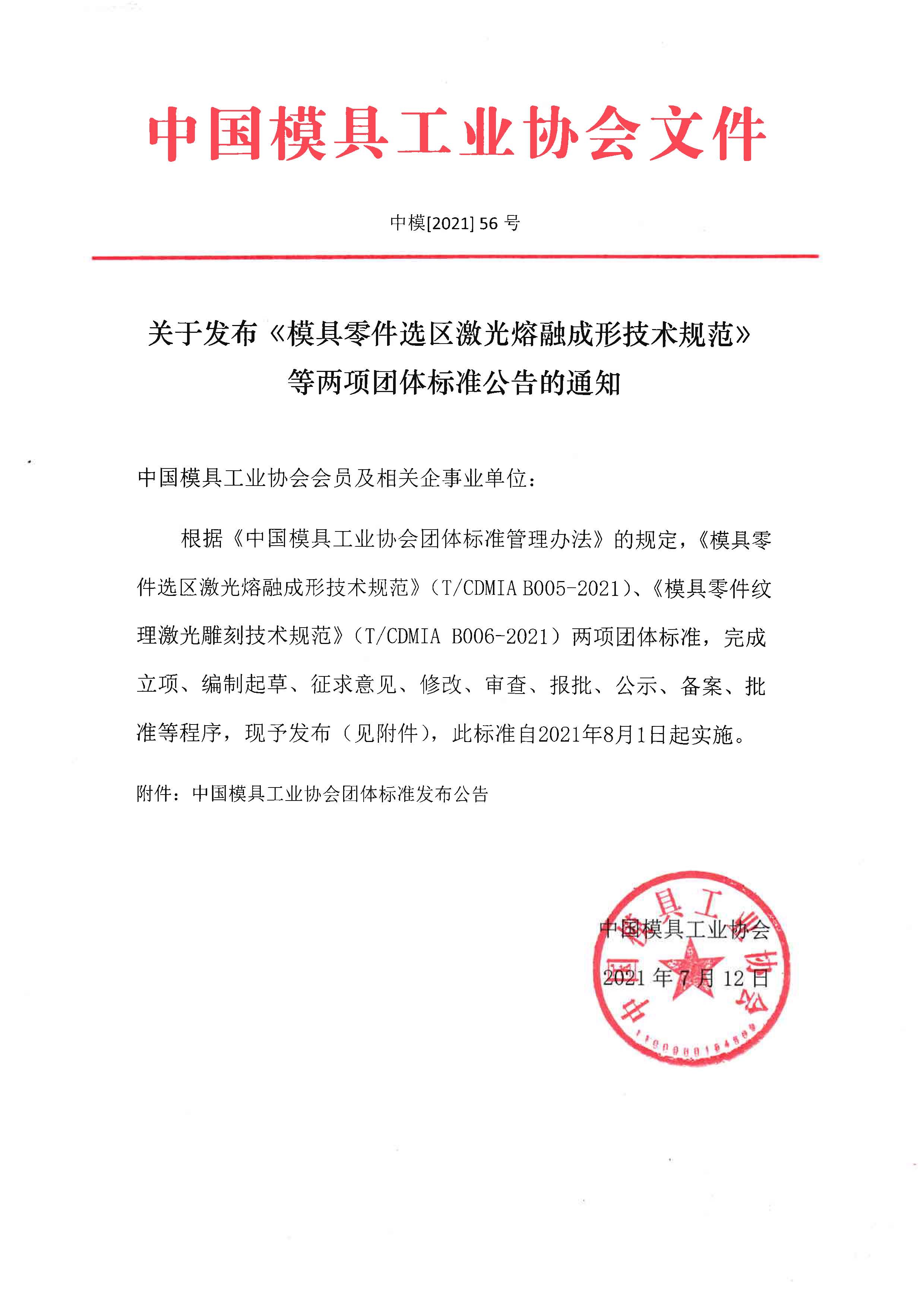 关于发布《模具零件选区激光熔融成形技术规范》等两项团体标准公告的通知